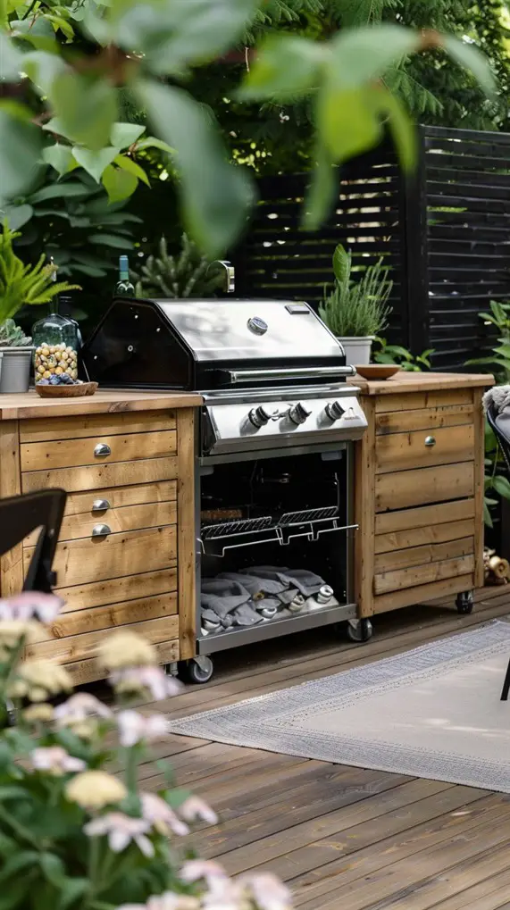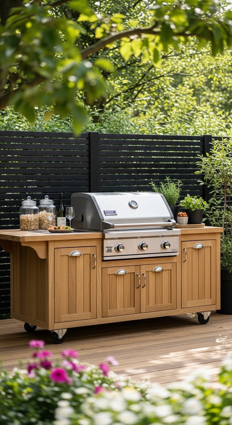 Flexibility is key for small or multi-use patios. This idea uses a high-quality rolling cart as the primary station. It docks next to a freestanding grill when in use and rolls away when you need more dance floor space. Look for carts with heavy-duty locking casters and stainless steel tops. You can have a “station” feel without the construction costs. It is the perfect solution for renters who cannot build permanent structures. Style the cart with hooks for towels and baskets for condiments.