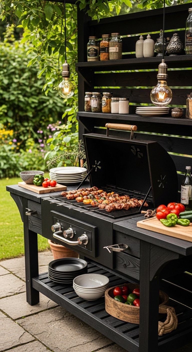 Move over stainless steel; matte black is the new king of cool. This station features a grill with a black powder-coated finish, paired with dark grey or charcoal cabinetry. The result is a moody, sophisticated look that disappears into the shadows at night, letting the fire and food take center stage. To prevent it from looking too heavy, incorporate light wood decking or a cream-colored stone backsplash. This high-contrast look is perfect for urban lofts or minimalist patios. The dark surfaces also hide soot and smoke stains better than lighter alternatives.