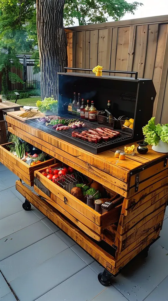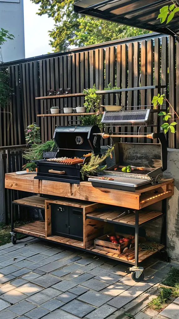 This design blends the “Urban” and “Oasis” concepts but leans heavily into modern conveniences. It features smart grills that can be controlled via smartphone, integrated Bluetooth sound systems, and hidden rotisserie motors. The look is sleek—think glass-fronted mini-fridges and smooth composite decking. Privacy screens made of horizontal wood slats often flank the station to block the view of neighboring buildings. It creates a high-tech, private bubble within the city where you can relax and cook with precision.