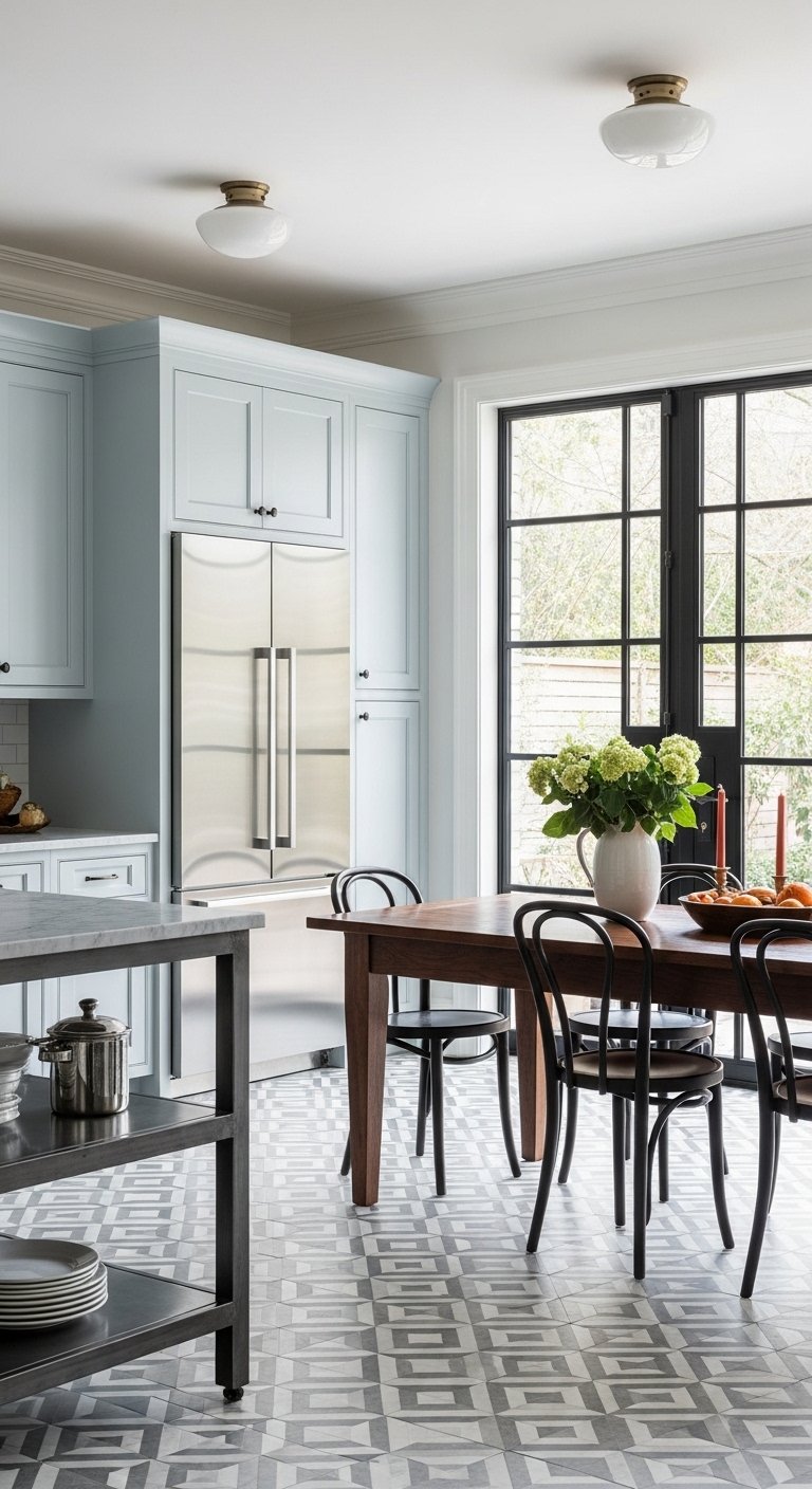 A stainless steel prep table brings the efficiency of a commercial kitchen into your home. The reflective surface bounces light around the room which helps a small kitchen feel brighter and larger. This material is non-porous and incredibly hygienic which makes it ideal for handling raw meats or fish. The sterile look pairs well with colorful accessories or warm wood floors to avoid feeling too clinical. Most commercial prep tables come in narrow depths of 18 or 24 inches. The lower shelf provides ample storage for large pots and appliances that do not fit in standard cabinets. This design is virtually indestructible and handles hot pans without damage.
