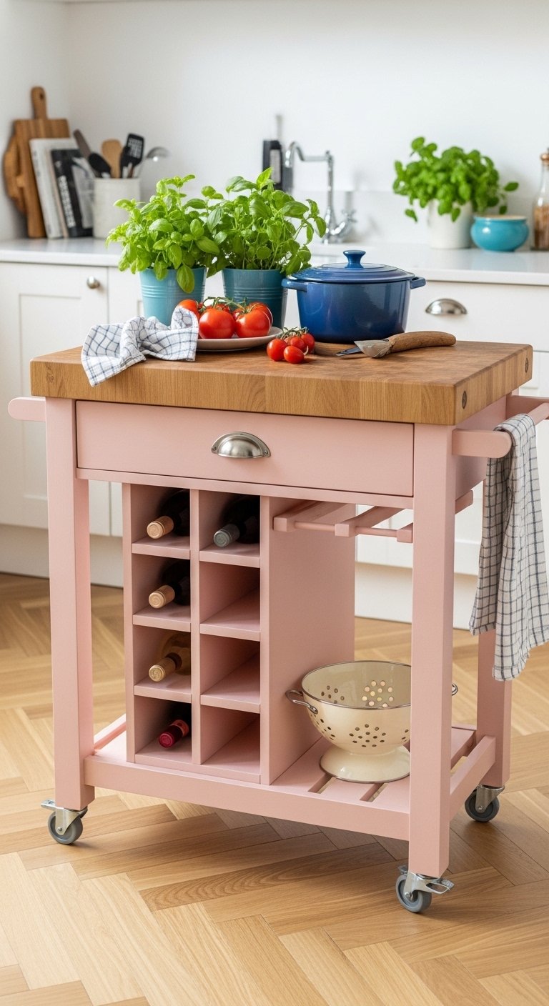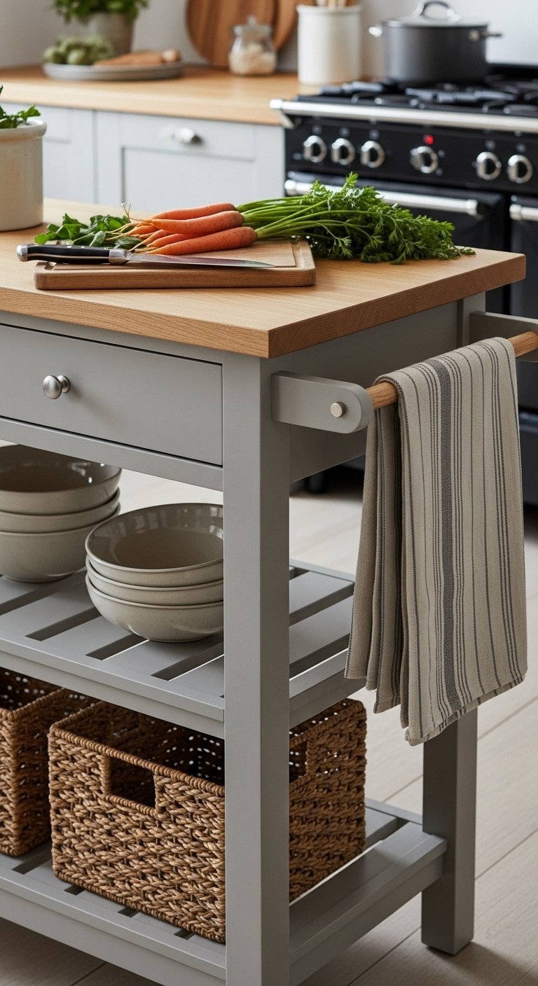 A slim rolling cart offers the ultimate flexibility for narrow kitchens where permanent fixtures are impossible. The visual appeal lies in its lightweight frame and open structure which prevents the room from feeling cramped. Metal frames paired with light wood tops create a clean and airy aesthetic that suits modern or industrial styles. You can easily wheel this unit into the center of the room during meal prep and tuck it away against an unused wall when guests arrive. The wheels should be locking casters to ensure stability while you chop vegetables or roll out dough. High-quality rubber wheels protect your flooring from scratches while providing smooth movement. This option serves as an excellent mobile bar cart for evening entertaining as well.
