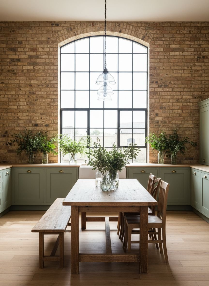 Nothing says “Industrial Chic” quite like the raw, historical texture of exposed brick. If your home has original brick walls hidden behind drywall, exposing them creates an instant focal point that brings warmth and history to the kitchen. If not, high-quality brick veneers can mimic the look perfectly. The rough texture of the red or whitewashed brick contrasts stunningly with sleek appliances.