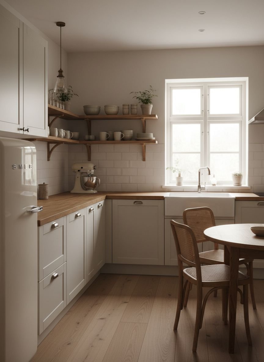 Open shelving is a hallmark of Scandinavian design, but it must be executed with intentionality to avoid clutter. This style replaces upper cabinets with floating shelves made of light natural wood. The goal is to force a curation of your kitchenware. You display only what is beautiful and used daily—stoneware mugs, clear glass jars for pantry staples, and simple plates.