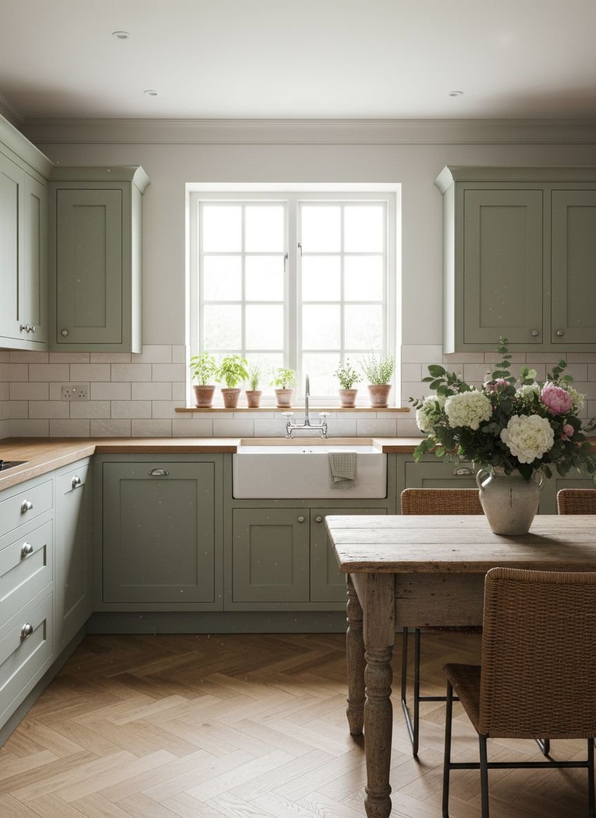 • Cabinet Color: Creamy White (e.g., Benjamin Moore “Swiss Coffee”) or Sage Green.