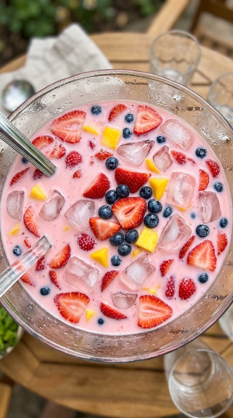 The Assembly: Fill a large, clear glass bowl with your ice. Arrange the fruit spheres and berries over the ice in a colorful mosaic.