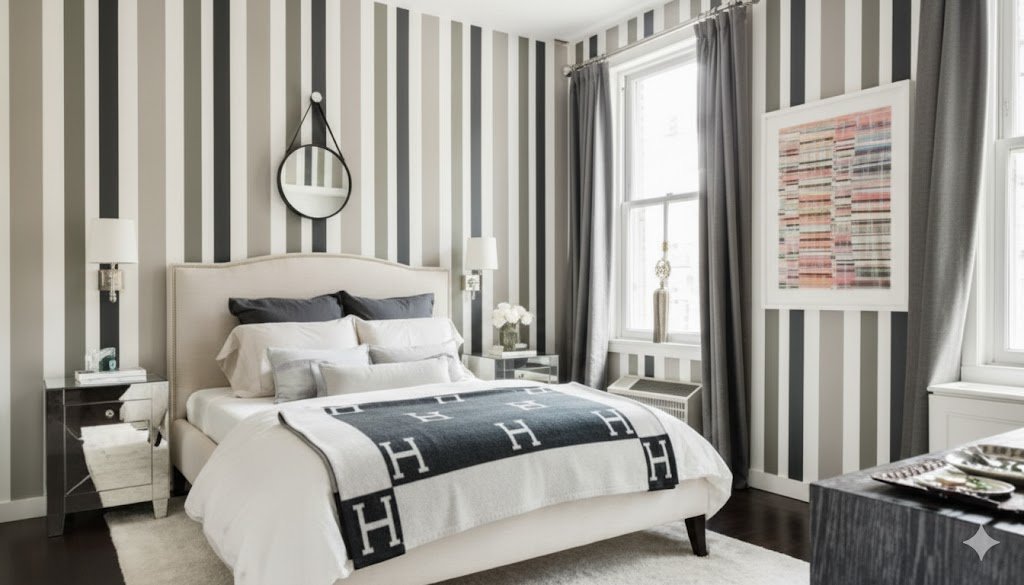 Here’s something I learned from trying diagonal stripes in a small bathroom – they work better in bigger spaces. In tiny rooms, all those angles can make the space feel chaotic. But in a good-sized bedroom, they create visual interest without overwhelming.