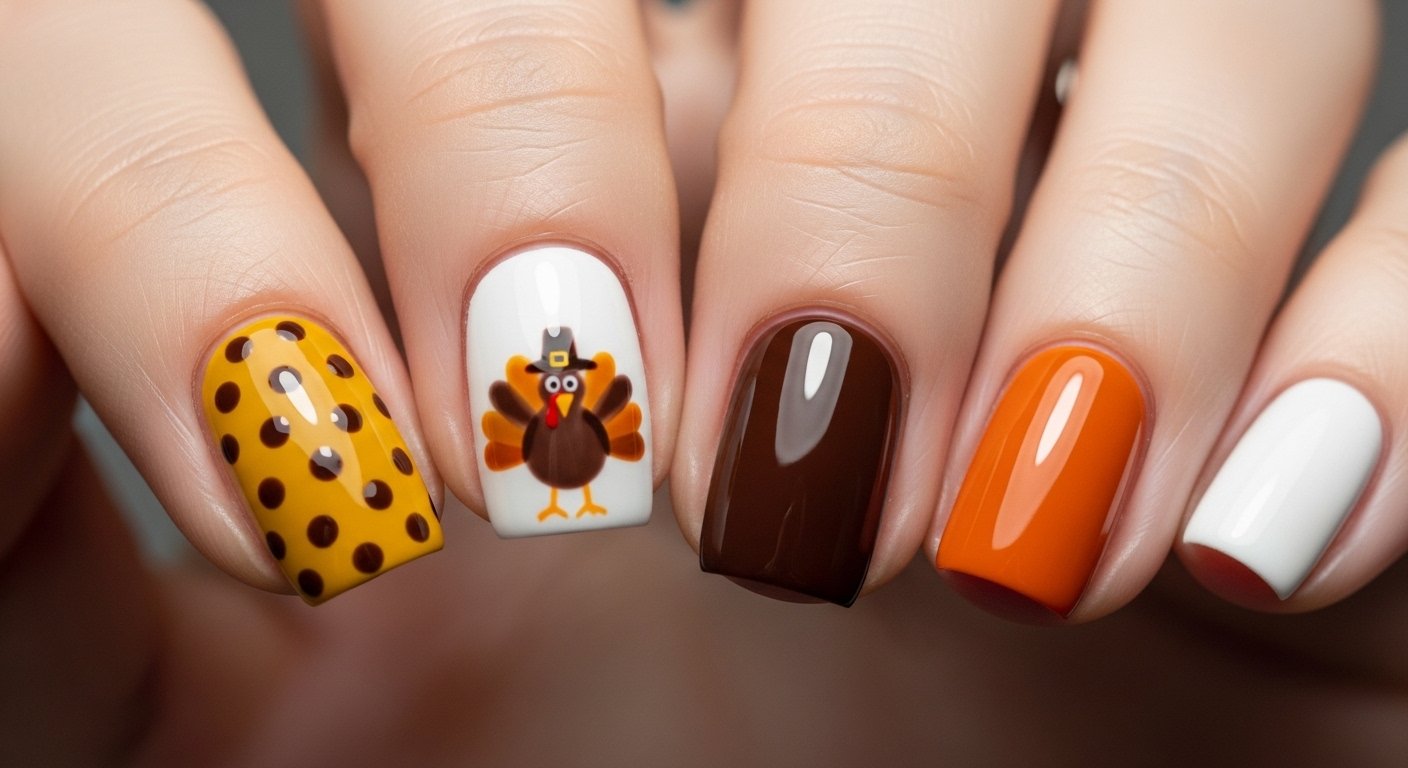 This design brings a playful spirit to your fingertips without overwhelming your entire look. A neutral base color like beige or soft cream allows the character art to stand out. You paint a small, stylized turkey on the ring finger while keeping the other nails simple. This balance prevents the manicure from looking too busy or costume-like. The turkey feathers usually incorporate traditional fall colors like red, orange, and yellow to tie the whole look together.