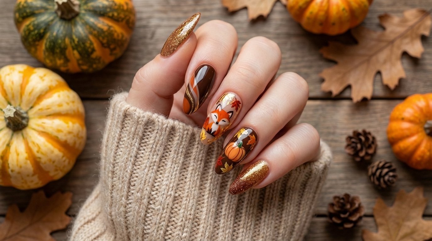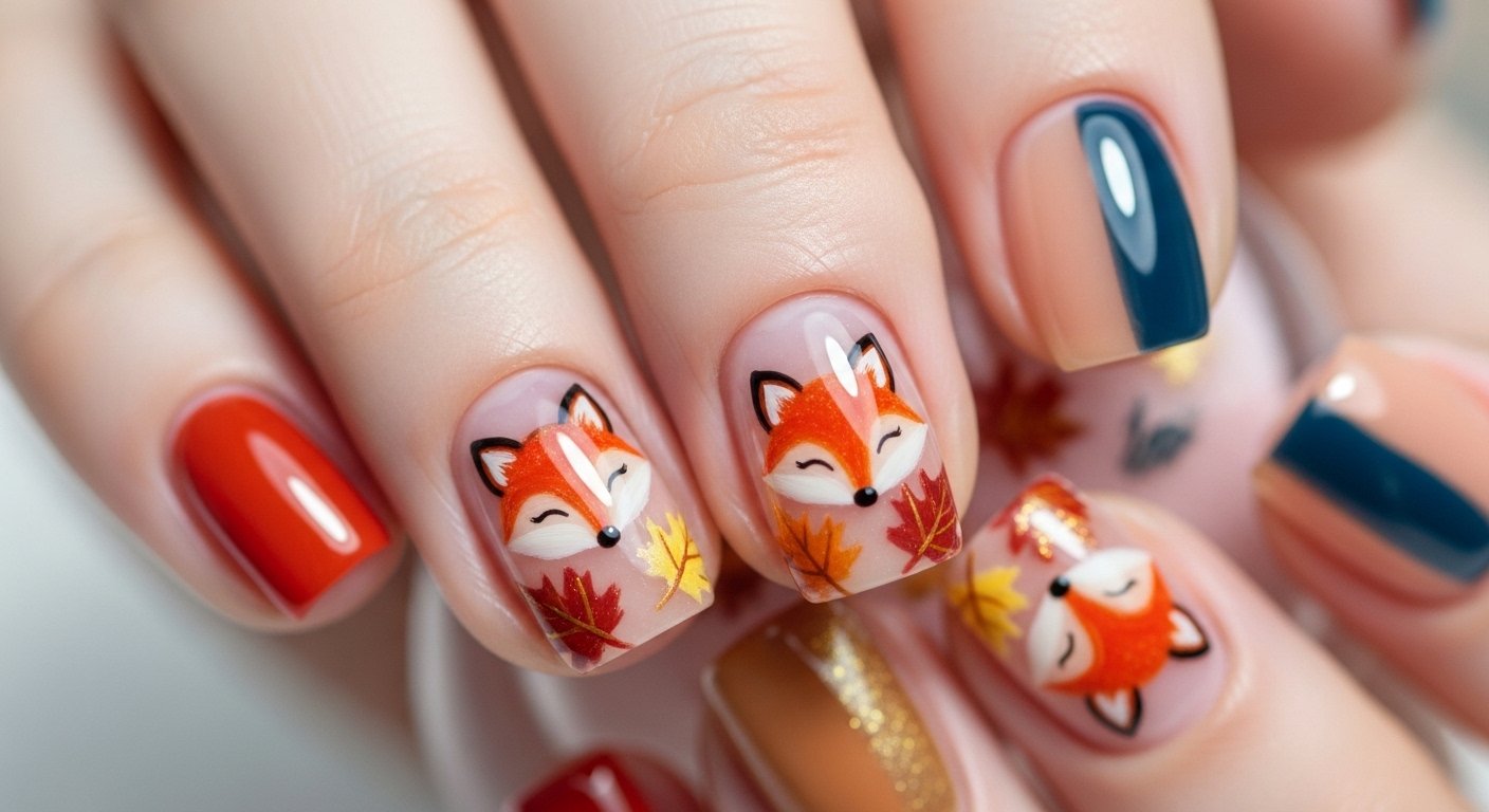 Woodland creatures add a storybook element to your manicure. This design features a small fox face or tail alongside scattered leaves. The burnt orange of the fox perfectly matches the falling leaves. You typically paint the fox on a white or light grey accent nail to ensure the colors show up true. The other nails can feature green ferns or brown acorns.