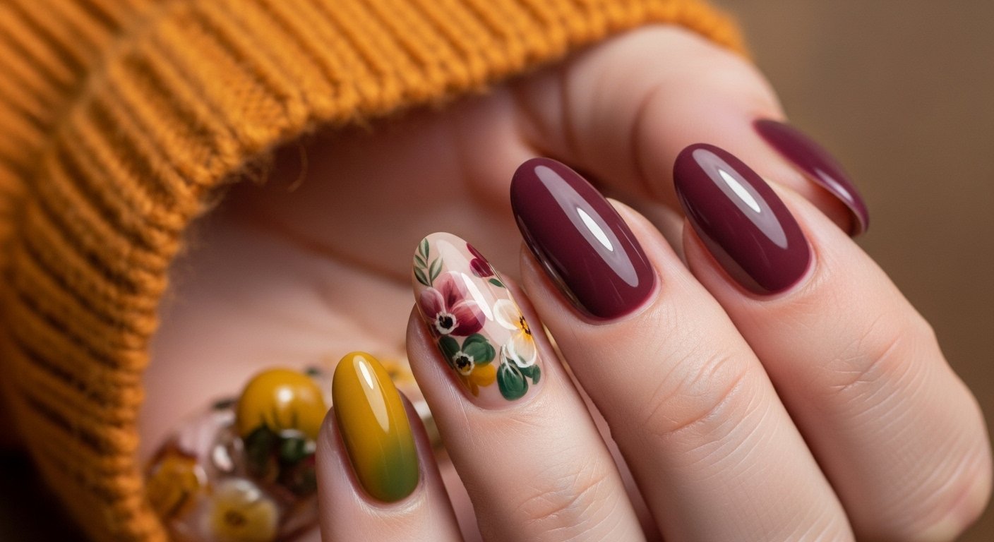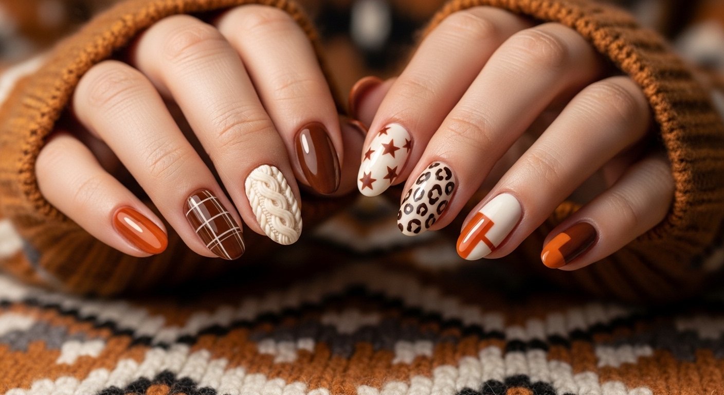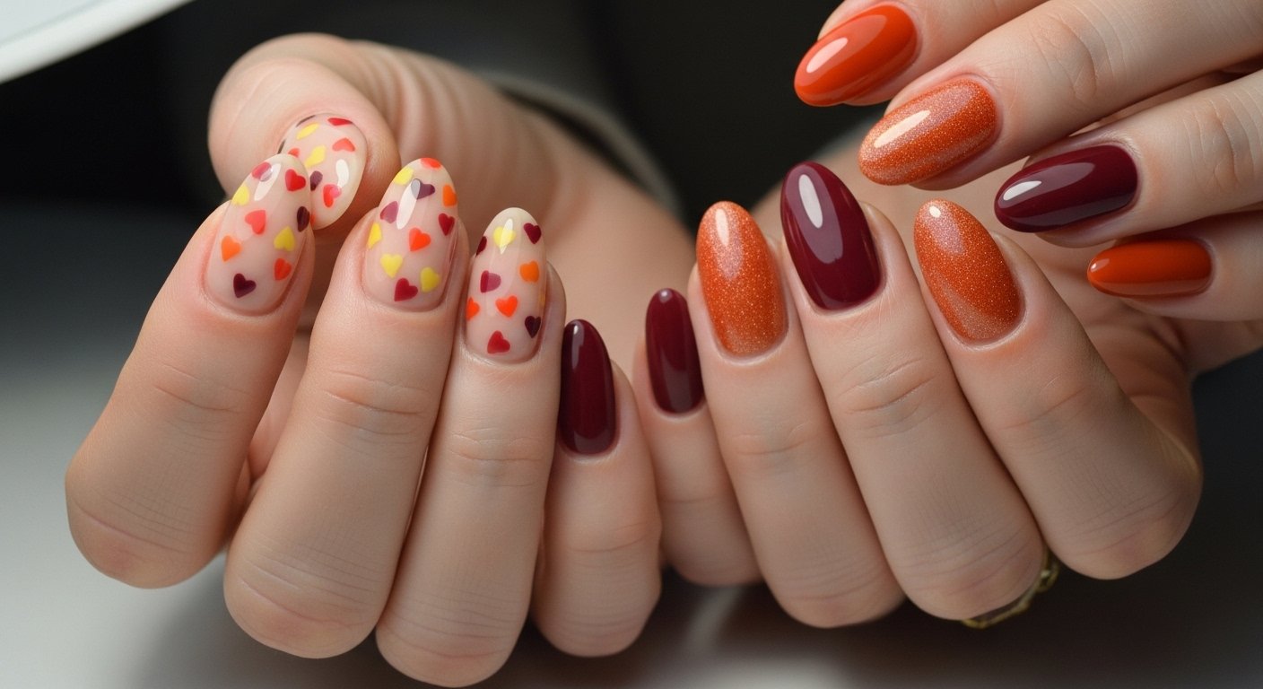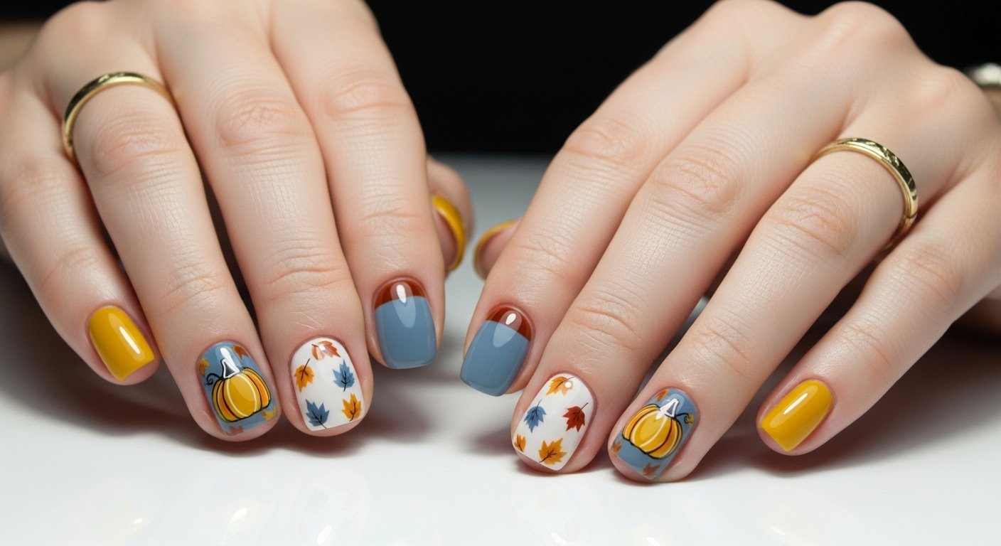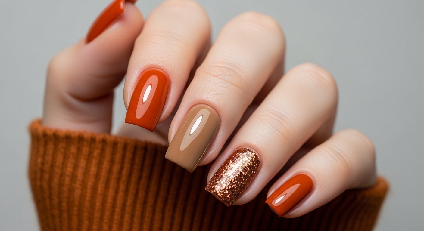 The “Skittle” manicure trend continues to dominate because it requires zero drawing skills. You simply paint each nail a different complementary color from an autumn palette. Think mustard yellow, terracotta, olive green, cream, and deep chocolate. The visual interest comes from the harmony of these earthy shades sitting side by side. It represents the changing colors of a forest landscape perfectly.