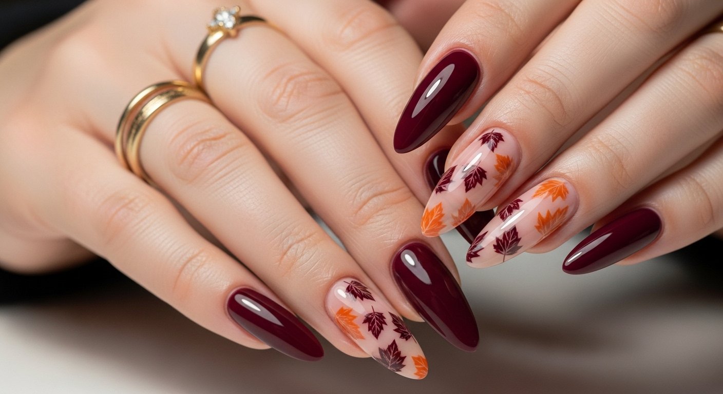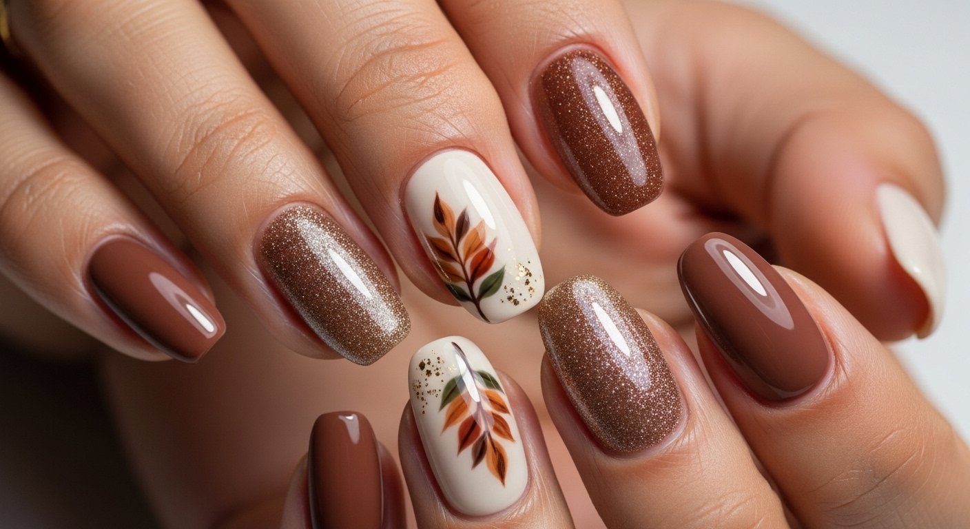 Minimalism remains a strong trend for those who prefer a clean aesthetic. You begin with a “your nails but better” sheer pink or milky white base. You then hand-paint a single, delicate leaf on just one or two fingers. The leaf can be a simple outline in black or a filled shape in gold or rust. This restraint makes the design look high-end and intentional.