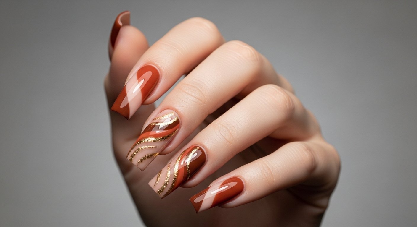 This final look takes the classic burnt orange and adds elements of opulence. You combine a glossy terracotta polish with gold flakes or marble effects. The marble look is achieved by swirling orange, white, and clear polish together on a palette before scooping it onto the nail. The gold flakes are pressed in randomly to catch the light.