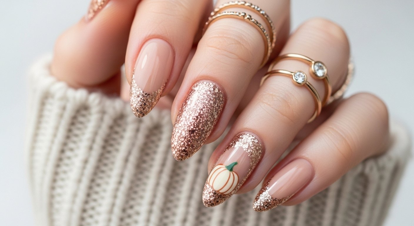 Capturing the essence of falling leaves requires the right mix of sparkle and negative space. This look uses a clear or sheer nude base to let the gold and copper glitter really shine. The glitter pieces mimic the irregular shapes of dried foliage on the ground. You concentrate the glitter at the cuticle or the tip to create a gradient effect. This technique makes regrowth less visible and extends the life of your manicure.