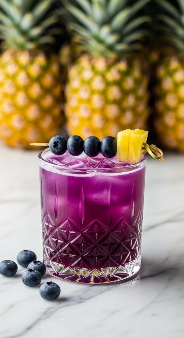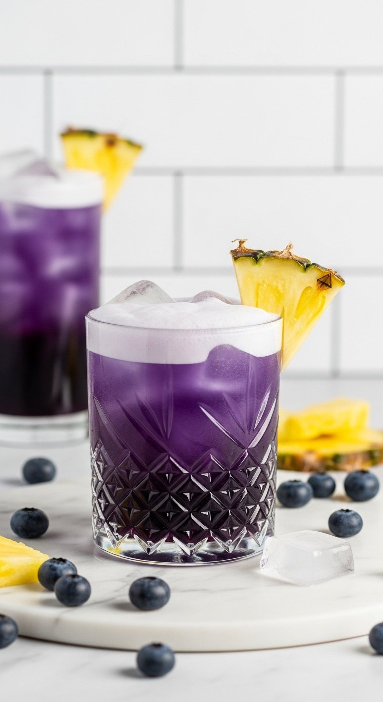 Settle and Garnish: Let the drink sit for just a few seconds so the foam can rise to the top and set into a perfect white layer. Lay the blueberry skewer across the rim and tuck a fresh pineapple frond into the foam.