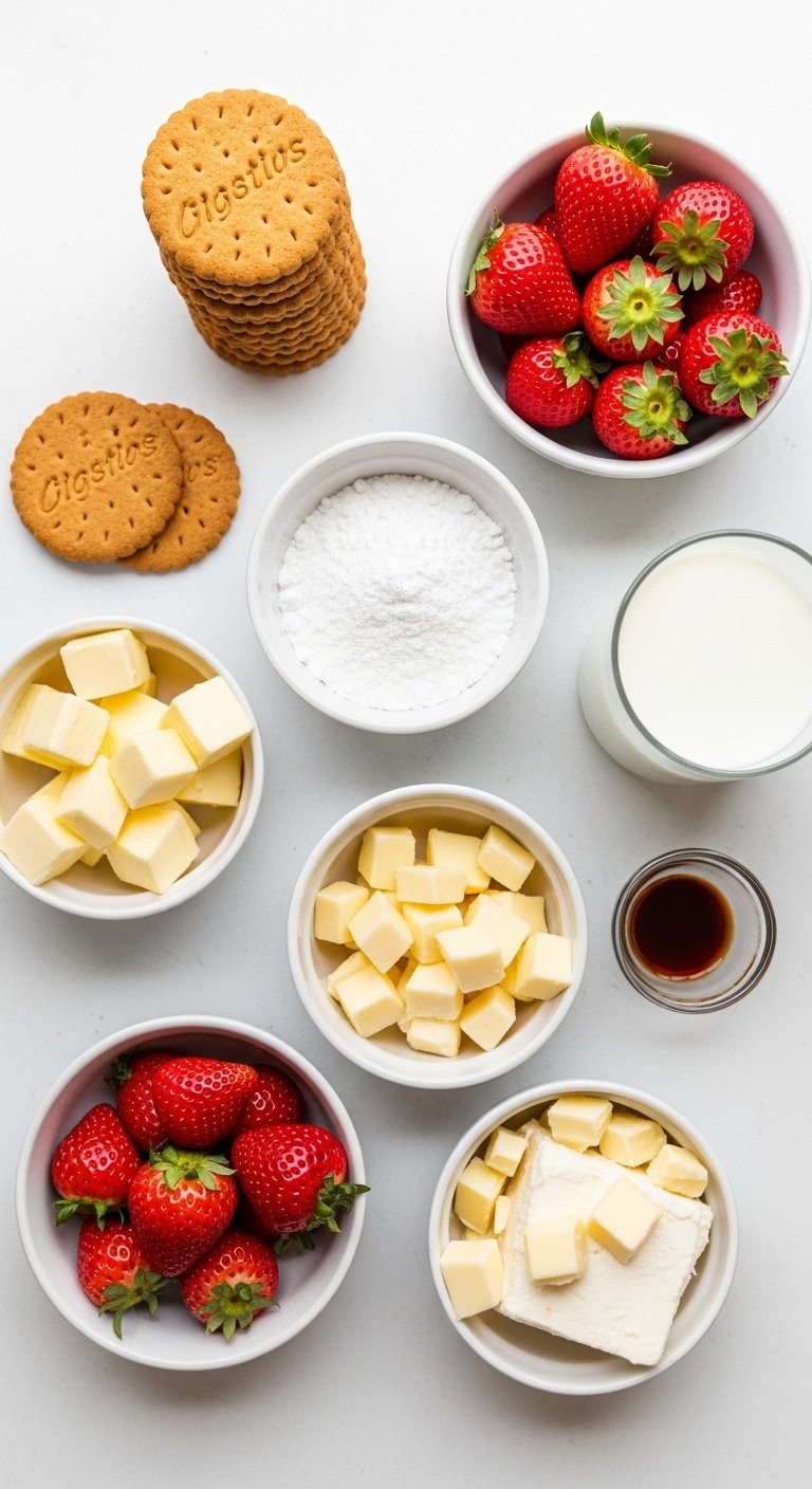 Gathering the right components sets the stage for a perfect white chocolate strawberry cheesecake. You need full fat blocks of soft dairy to build the rich base. High quality cocoa butter bars provide the best melting experience. Fresh spring produce delivers the brightest red colors for the final presentation. A coarse honey graham cookie builds the crunchy bottom layer. Granulated cane sugar sweetens the tart fruit perfectly. You lay all these items out on a clean counter before starting. This organization prevents mistakes during the fast mixing process. Beautiful raw components look amazing in prep photography.