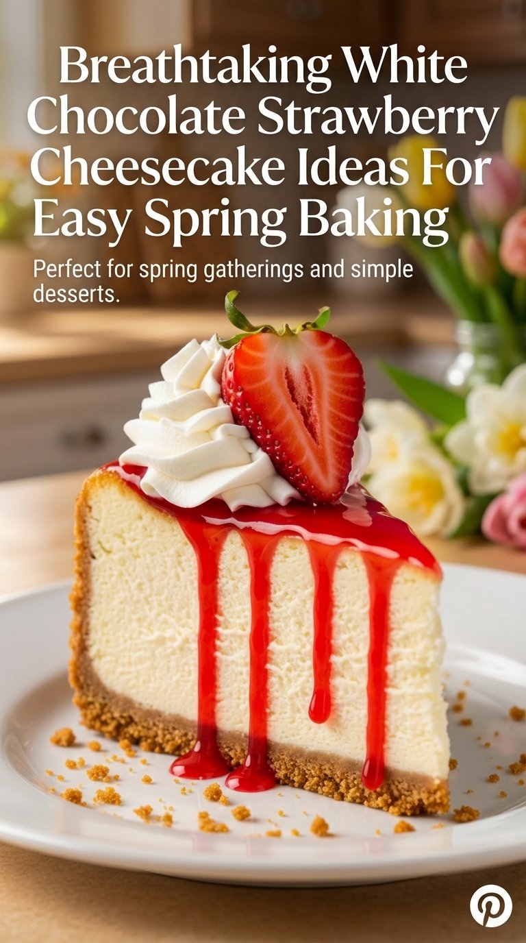 This luxurious dessert combines rich creamy textures with bright acidic fruit flavors. You learned exact methods to control oven temperatures and style your plates like a true professional. Which unique cookie crust will you try baking first this spring season? Follow us on Pinterest for more White Chocolate Strawberry Cheesecake inspiration.