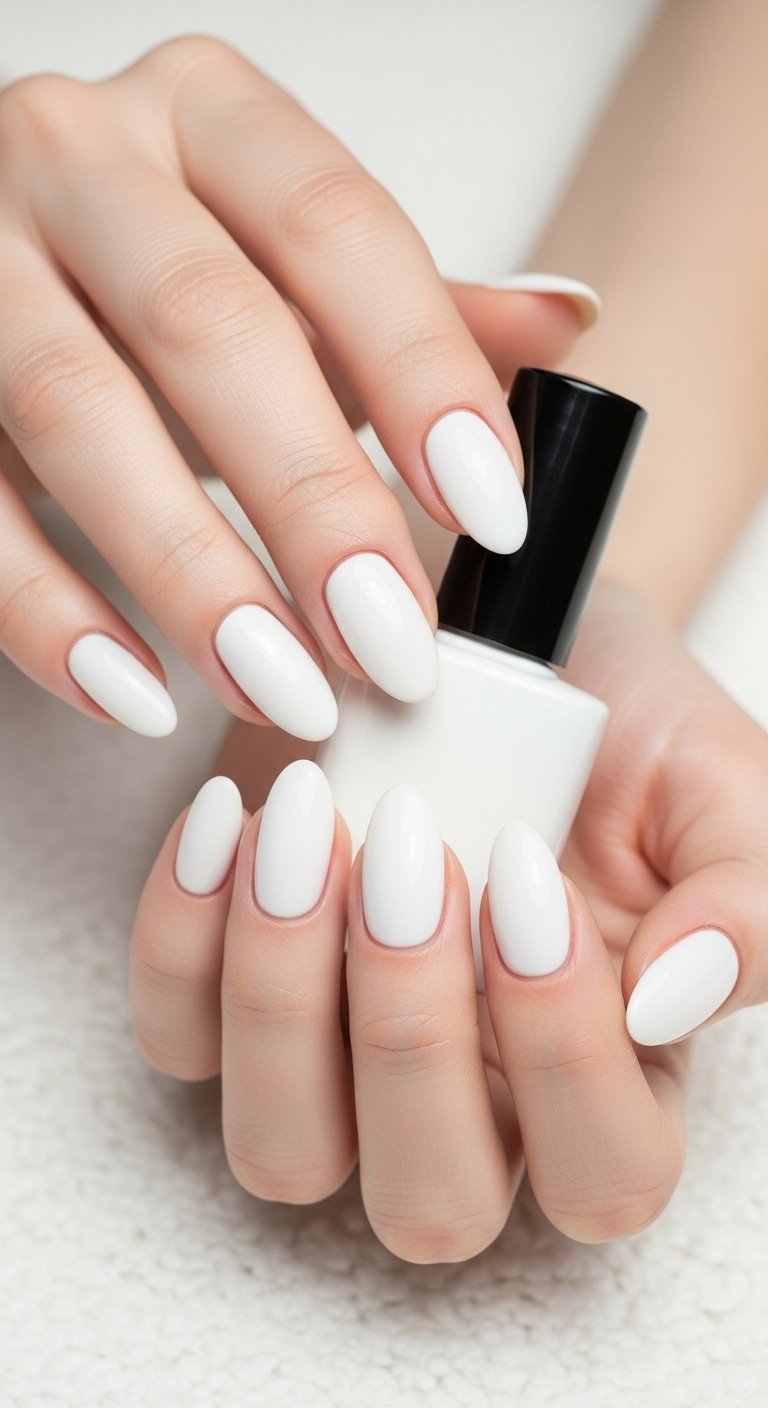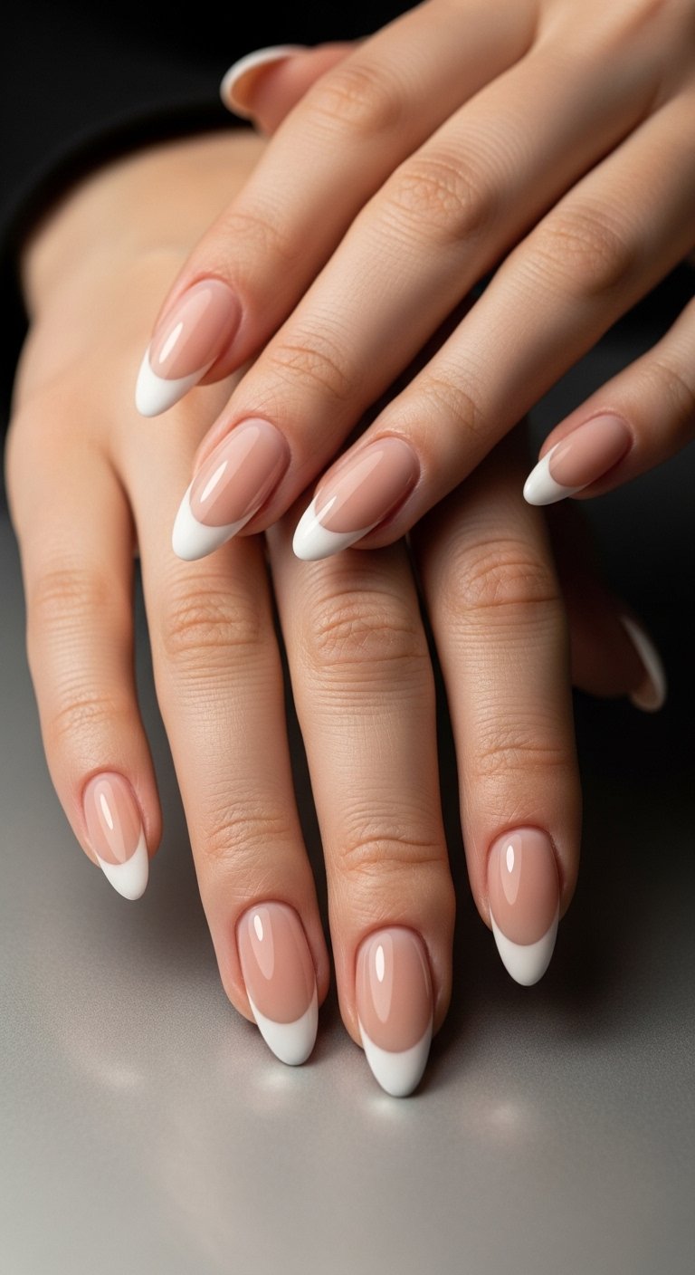 Almond shape white French tip nails flatter every single hand shape. The tapered sides and rounded point elongate your fingers visually. The soft curves of the almond shape suit a deep smile line. You create a deeply feminine look with this specific combination. The white polish accentuates the pointed tip. You file the side walls straight before rounding the top edge. The sheer nude base blends into the dramatic white tip. Many brides choose this elegant shape for their wedding day. The graceful silhouette feels softer than a harsh square shape. You maintain this shape by filing the edges gently every few days. Save this idea to your Pinterest. Pro Tip. Use a glass nail file to shape the almond edges and prevent splitting.