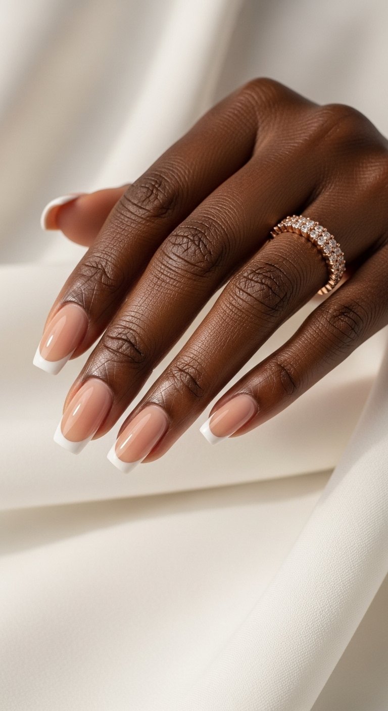 Classic white French tip nails remain the absolute standard for elegance. The crisp white arc across the natural nail creates a polished look. You achieve this timeless aesthetic by pairing a soft nude base with a stark white tip. The pure contrast makes your nail beds appear longer and healthier. Women everywhere request this style for daily wear and formal events alike. A sheer pink base coat mimics natural nail coloring. You apply the opaque white polish along the free edge using a thin brush. This technique requires steady hands. The pristine approach suits any outfit in your wardrobe. You project effortless grace with this clean design. Save this idea to your Pinterest. Pro Tip. Use a clean up brush dipped in acetone to refine the smile line.