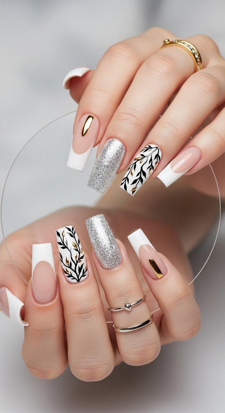Abstract white French patterns break all the traditional rules. You replace the standard solid white curve with organic shapes and squiggles. The white polish flows along the nail edge in unpredictable waves. This artistic approach shows off your creative personality. You use a dotting tool and a liner brush to create fluid shapes. The negative space remains a central part of the design. The sheer nude base grounds the wild abstract patterns. No two nails look exactly the same in this style. The asymmetrical designs feel current and edgy. You express your individuality through the unique placement of the white polish. Save this idea to your Pinterest. Pro Tip. Start with small abstract shapes and build them up slowly for the best visual balance.