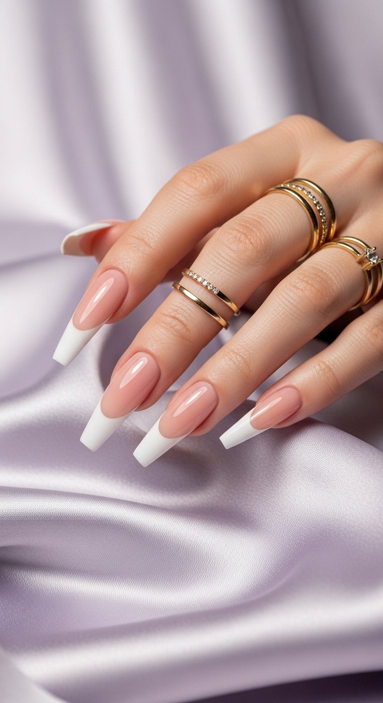 The coffin shape with crisp white tips delivers pure glamour. The long tapered shape with a flat top demands attention. You paint a thick stark white tip across the squared off edge. The extreme length provides a massive canvas for the dramatic white polish. The sheer peach base adds a healthy glow to the nail bed. The sharp corners of the coffin shape contrast with the curved smile line. You need strong acrylic or gel extensions to support this long shape. The bold geometric angles create a fierce and fashionable aesthetic. You stand out in any crowd with these striking nails. Save this idea to your Pinterest. Pro Tip. Apply cuticle oil twice daily to keep the long extensions flexible and prevent snapping.