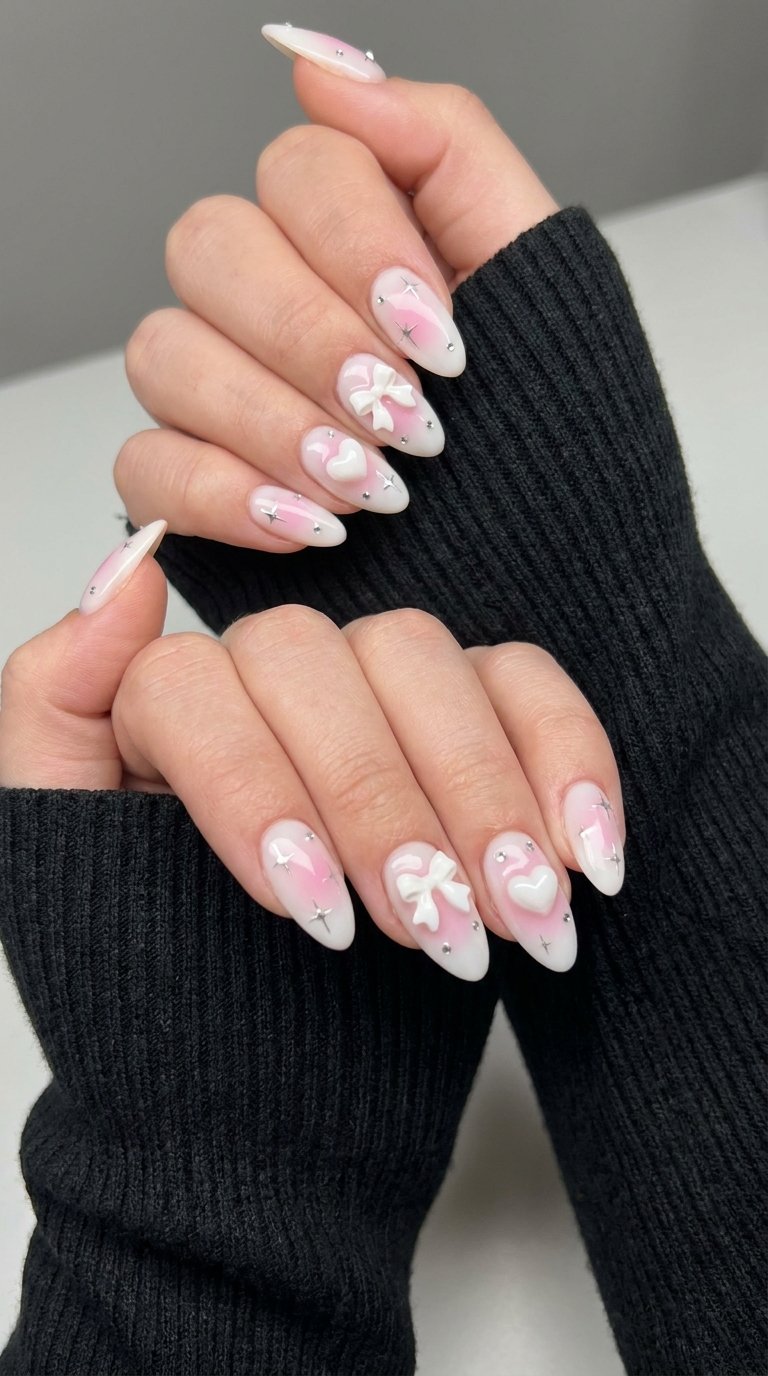 Warm pink tones blend into clear borders on this soft nail design. The center holds a bright cherry graphic. This creates a soft contrast against the bare natural nail bed. The aura effect draws the eye direct to the middle. You build this style with a blooming gel polish. Paint a sheer pink layer over your nail. Add a drop of darker pink right in the middle. The wet base pulls the pigment outward into a round shape. Cure the polish under a strong UV lamp. Place a small fruit sticker inside the dark pink circle. Seal the design with a thick glassy top coat. This step adds massive shine. The top coat protects the tiny graphic from chipping. Small details make everyday nail designs feel special. This style fits a medium almond shape best.