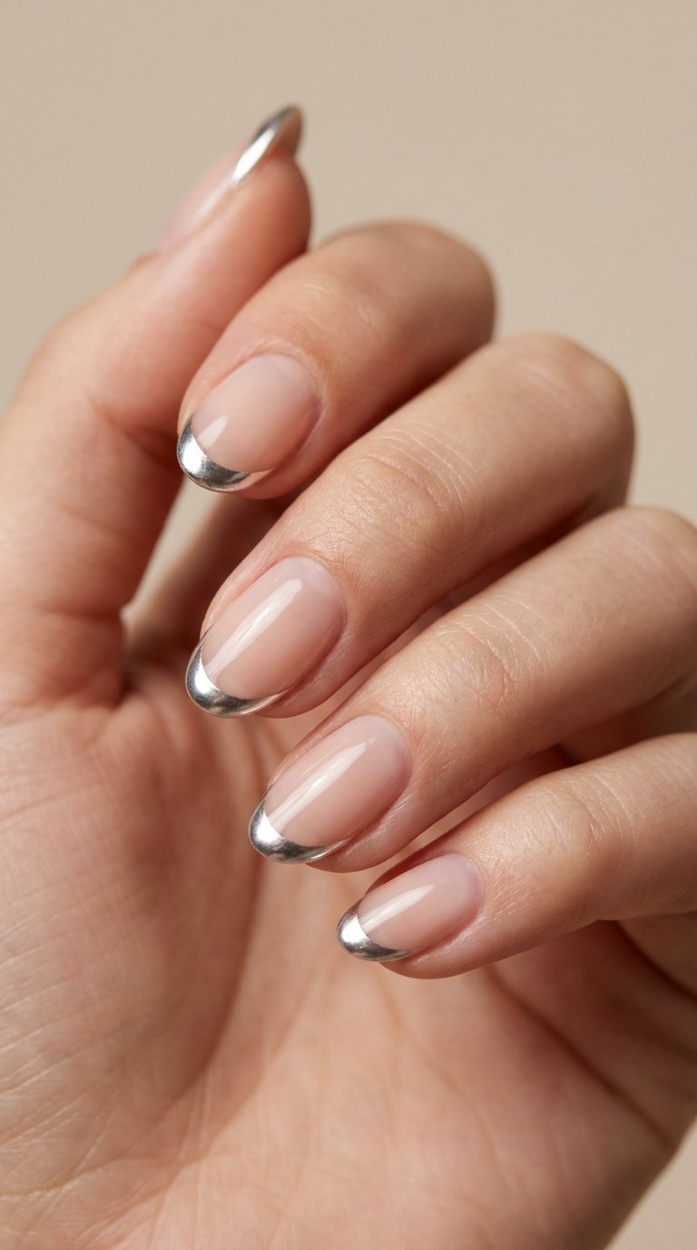 A razor sharp line of bright silver traces the very edge of the nail. The platinum line shines bright cold against a warm peach base. This micro French style provides a very subtle metallic flash. The thin line makes the nail bed look longer and elegant. You use a long striping brush to pull the silver line perfect straight. Dip the brush deep into a liquid platinum gel polish. Lay the brush flat against the free edge of the nail. Roll the finger slow to drag the brush across the tip. Keep the line thin and even from corner to corner. Correct any messy spots with a clean brush dipped in alcohol. Apply a high gloss top coat over the entire nail. This sleek design fits a medium square shape best.