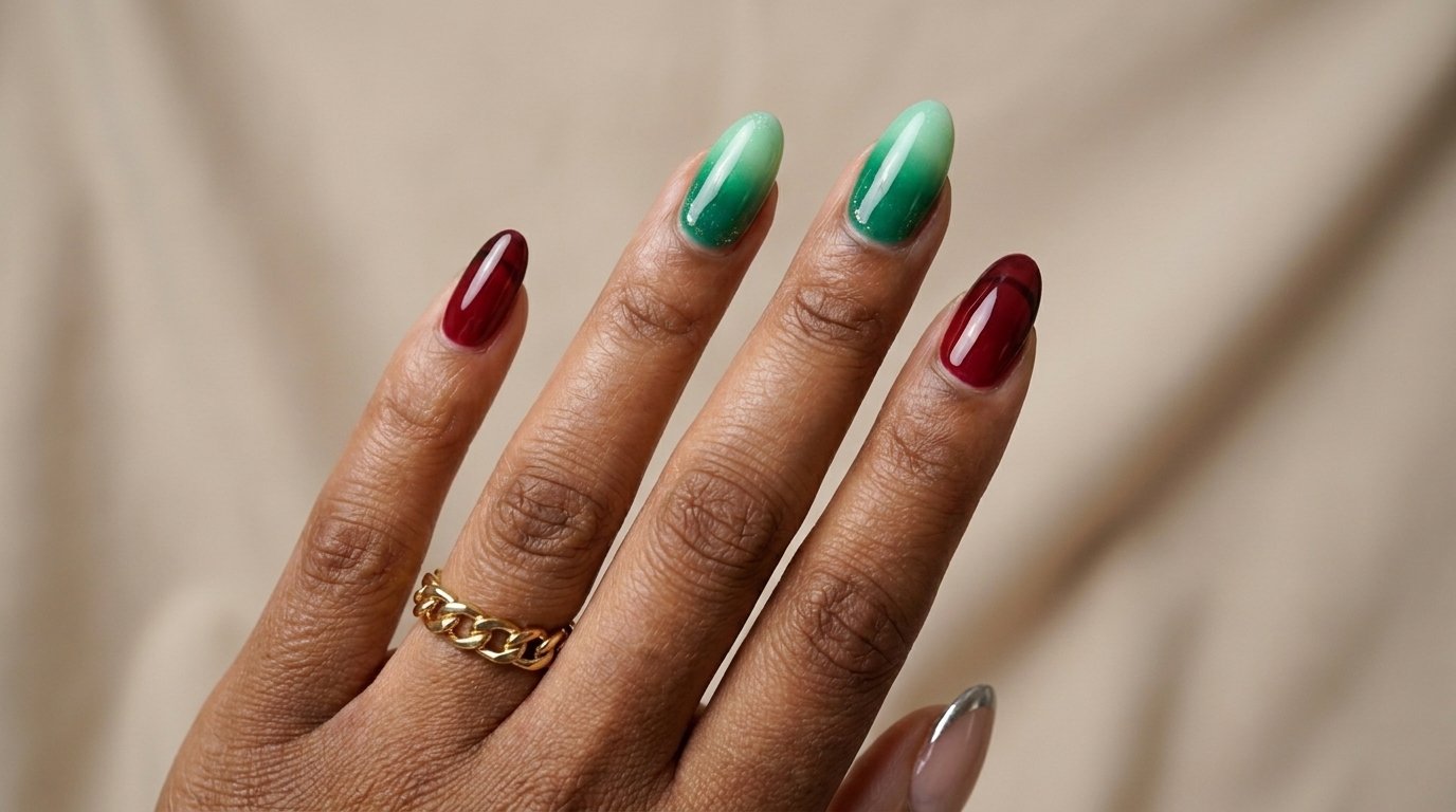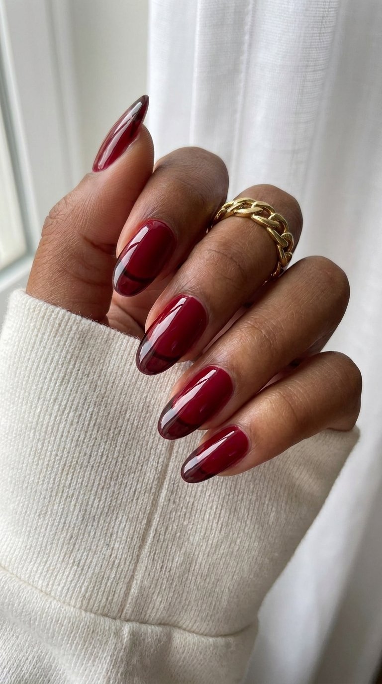 Deep red velvet tones fade into a dark shadow near the tip. This creates a fake 3D edge on a flat surface. The dark garnet color looks rich against pale winter skin. The magnetic polish traps light in a bright shifting band across the curve. You need a magnetic cat eye polish for this trick. Apply a dark black base color and cure it hard. Paint one thick coat of the garnet magnetic polish over the black base. Hold a strong magnet flat against the free edge of the nail. The magnetic dust pulls tight toward the tip. This leaves a dark shadow behind the bright red band. The contrast gives the illusion of a raised French tip. Cover the art with a thick glossy top coat. Long coffin shapes show off the illusion best.