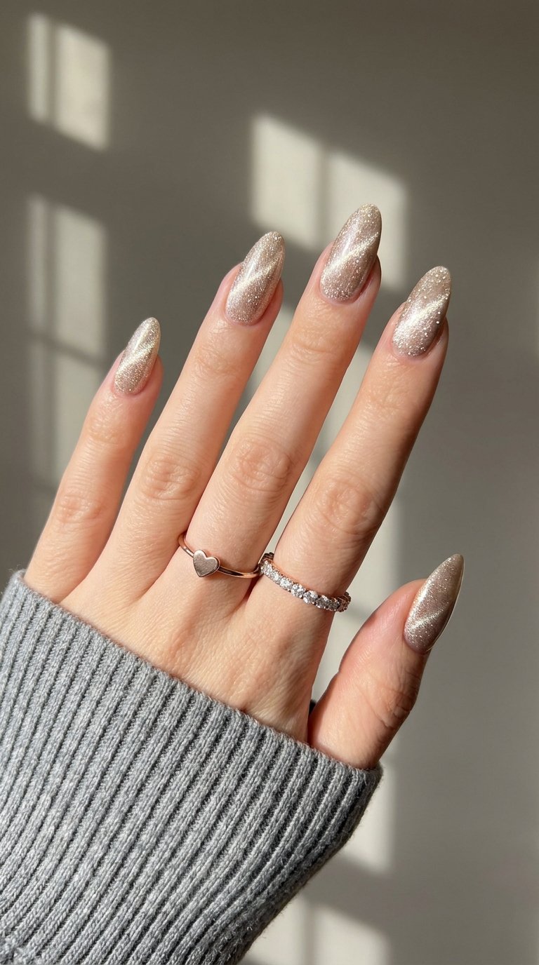 Soft white shimmer spreads across the entire nail surface. The finish looks exact like a smooth silk bedsheet. Light bounces off the curved nail arch in a wide bright band. This glowing effect fits fancy events and casual daily wear. You create this soft texture using a white magnetic gel polish. Paint two thin coats of the pearl polish over a clear base. Use a cylinder magnet to push the metallic dust around. Sweep the magnet up and down the side walls of the nail. This pushes the shimmer particles to the high center point. Cure the wet polish immediate to freeze the particles in place. Add a layer of hard gel for extra strength. Finish with a bright top coat. Short round nails look elegant with this soft pearl finish.