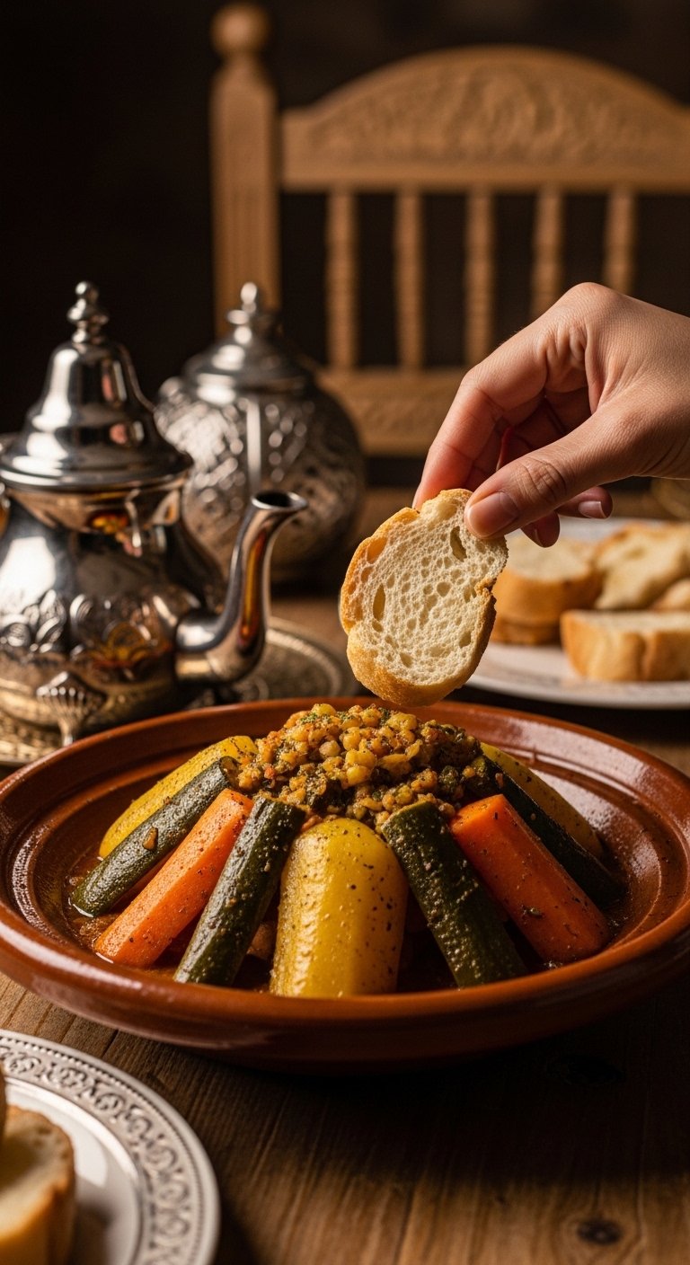 The Bread: Never serve a tagine with a fork! Serve it with warm Khobz (Moroccan crusty bread). The bread is your utensil.
