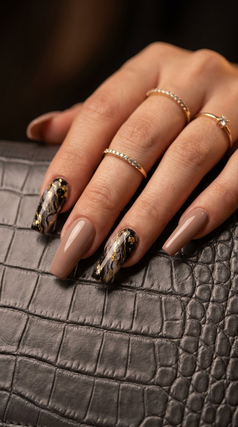 Transforming bare hands into art requires understanding color and light. Nail alchemy blends soft neutral nail shades for everyday wear with unexpected metallic flakes. You see a sheer beige base coat reflecting warm gold flecks under natural sunlight.