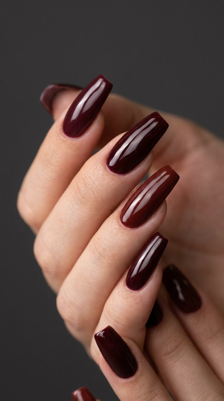 Dark red nails scream old Hollywood glamour. Crimson craze features a deep oxblood red shade. The color borders on black in low lighting.