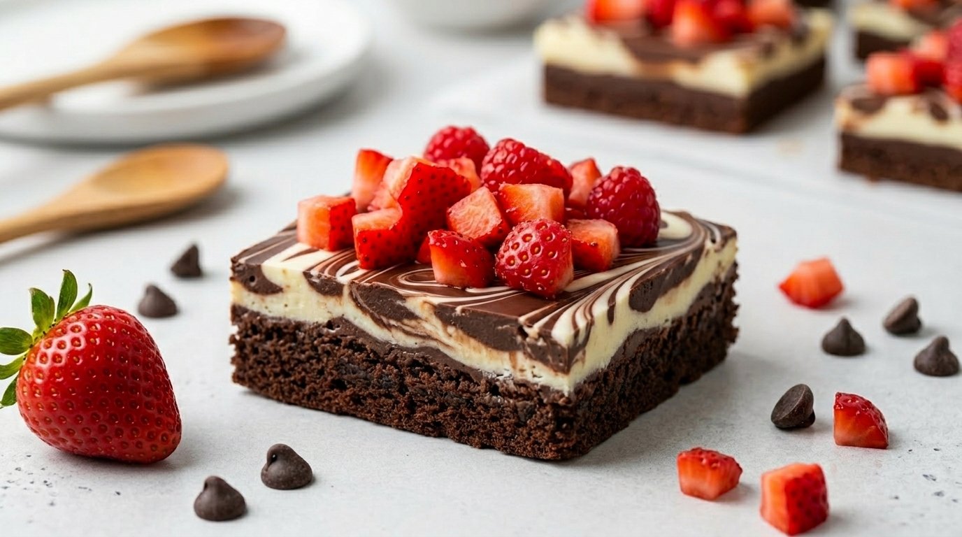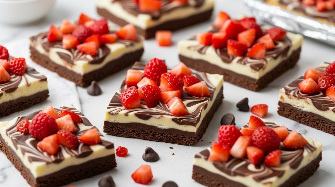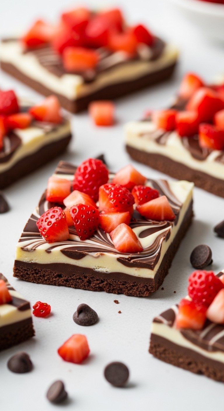 Top and Chill: Evenly sprinkle the dried, chopped fresh strawberries (or freeze-dried strawberries) across the warm chocolate. Press them down very lightly so they adhere. Place the entire pan in the refrigerator for at least 1 hour to cool and harden.