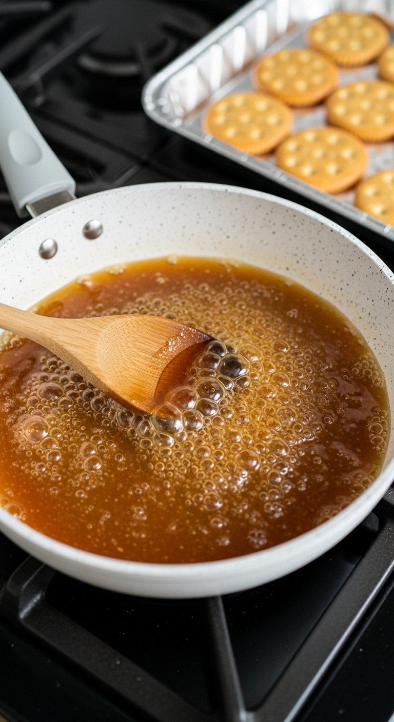 Bake the Toffee: Immediately pour the hot toffee mixture evenly over the crackers. Spread it quickly with a spatula to cover them completely. Carefully place the pan in the oven and bake for 7 minutes, or until the toffee is bubbly all over.