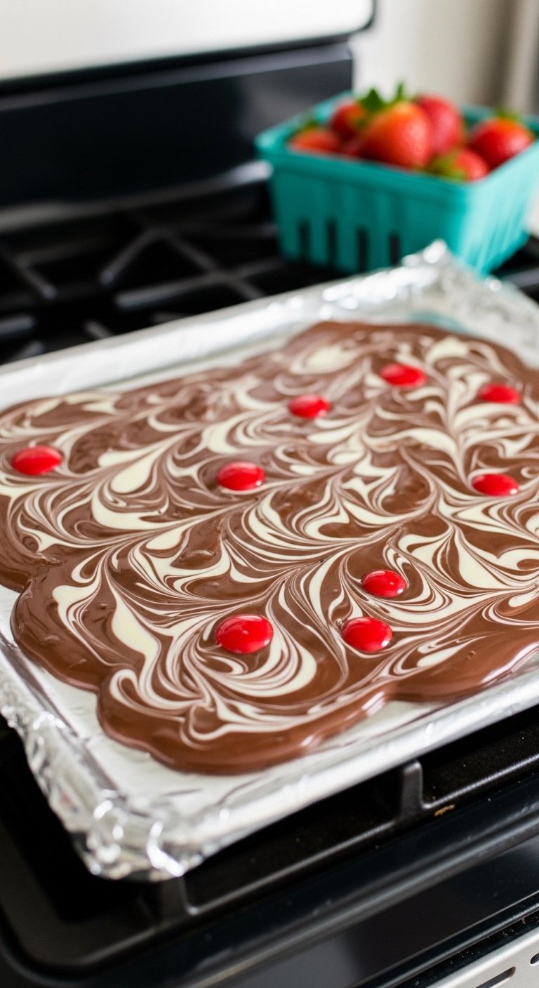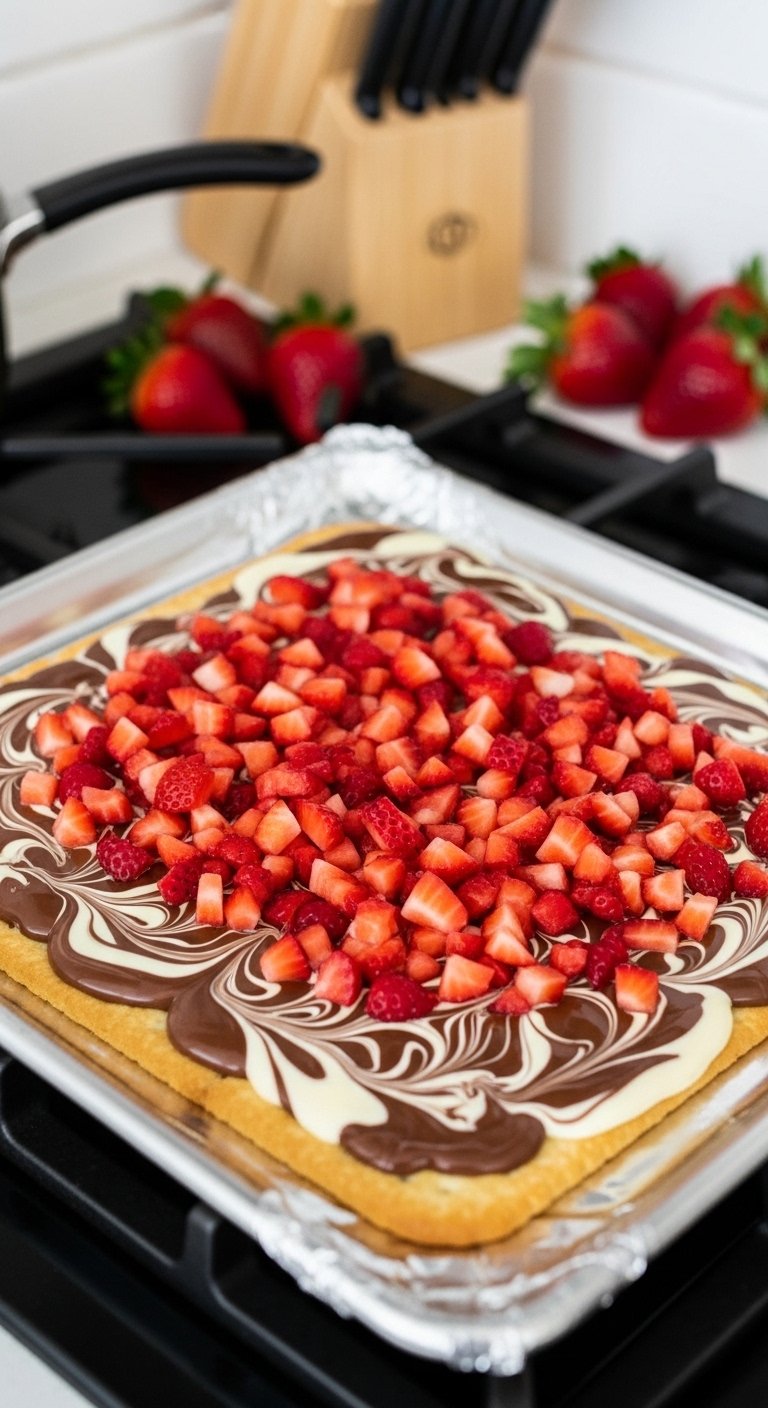 Prep the Pan and Fruit: Preheat your oven to 200°C (400°F). Line a large, rimmed baking sheet (jelly roll pan) with aluminum foil and spray lightly with non-stick cooking spray. Finely chop your fresh strawberries and use a paper towel to pat them completely dry to absorb excess moisture (this prevents the chocolate from getting soggy).