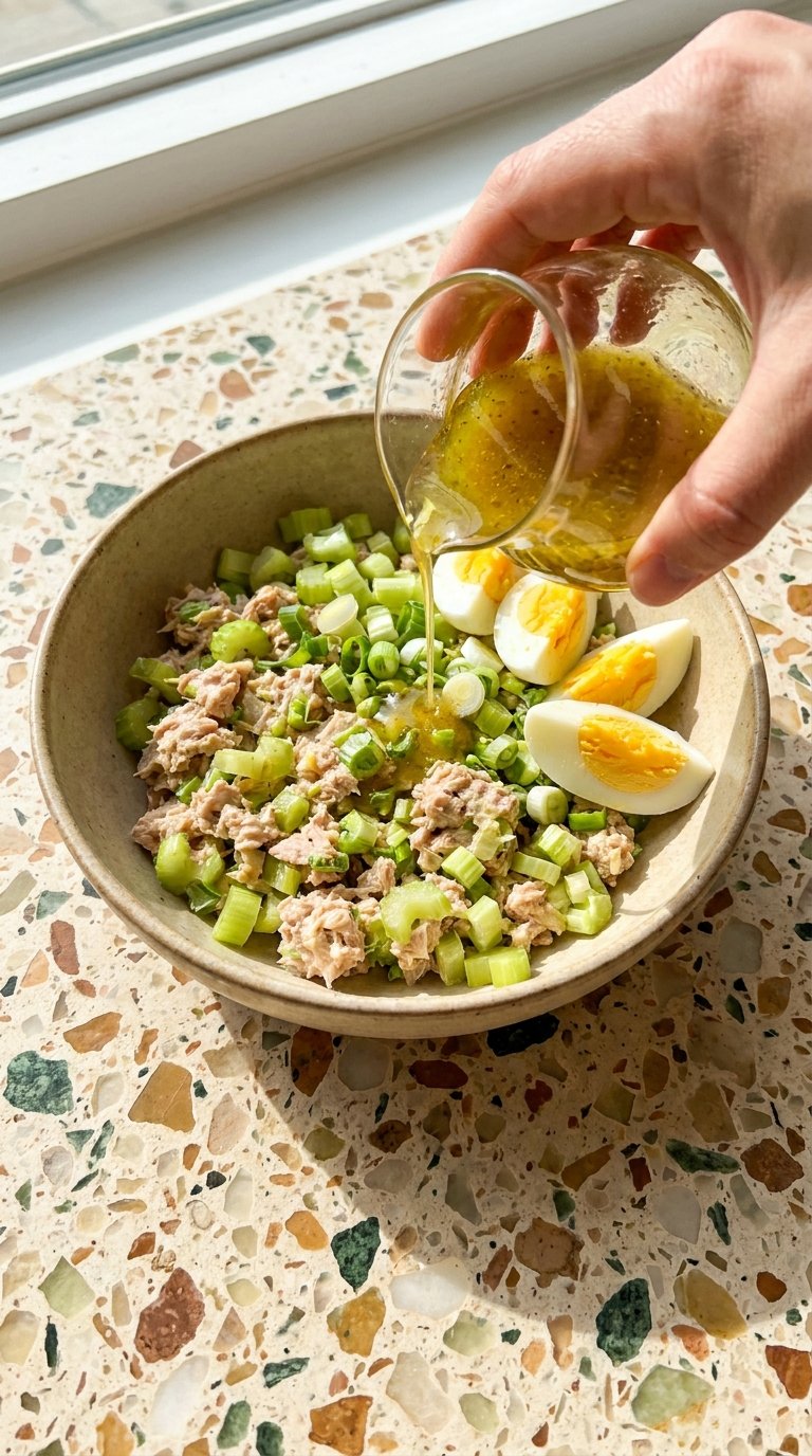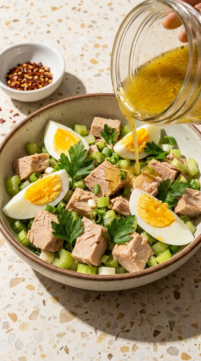 Proper assembly techniques determine the final texture of your dish. You begin by draining the canned fish completely dry in a fine mesh strainer. Pressing a fork against the meat removes excess water and prevents a soggy result. Next you peel the cooled hard boiled eggs and chop them into uniform squares. A large glass mixing bowl gives you plenty of room to combine the elements without spilling. You toss the flaked fish and chopped proteins together gently. Folding the crisp celery and sharp red onion into the bowl distributes the crunchy bits evenly. You spoon the mayonnaise and Dijon mustard over the dry ingredients. Stirring with a silicone spatula coats every single piece in the creamy dressing. You sprinkle the fresh dill along with the salt and pepper over the top. One final gentle mix incorporates the seasonings throughout the entire bowl. Covering the bowl tightly with plastic wrap prepares it for the refrigerator. Chilling the mixture for thirty minutes allows the complex flavors to marry beautifully. Pro Tip Serve the chilled mixture immediately after removing it from the cold fridge for the best mouthfeel. Save this idea to your Pinterest.