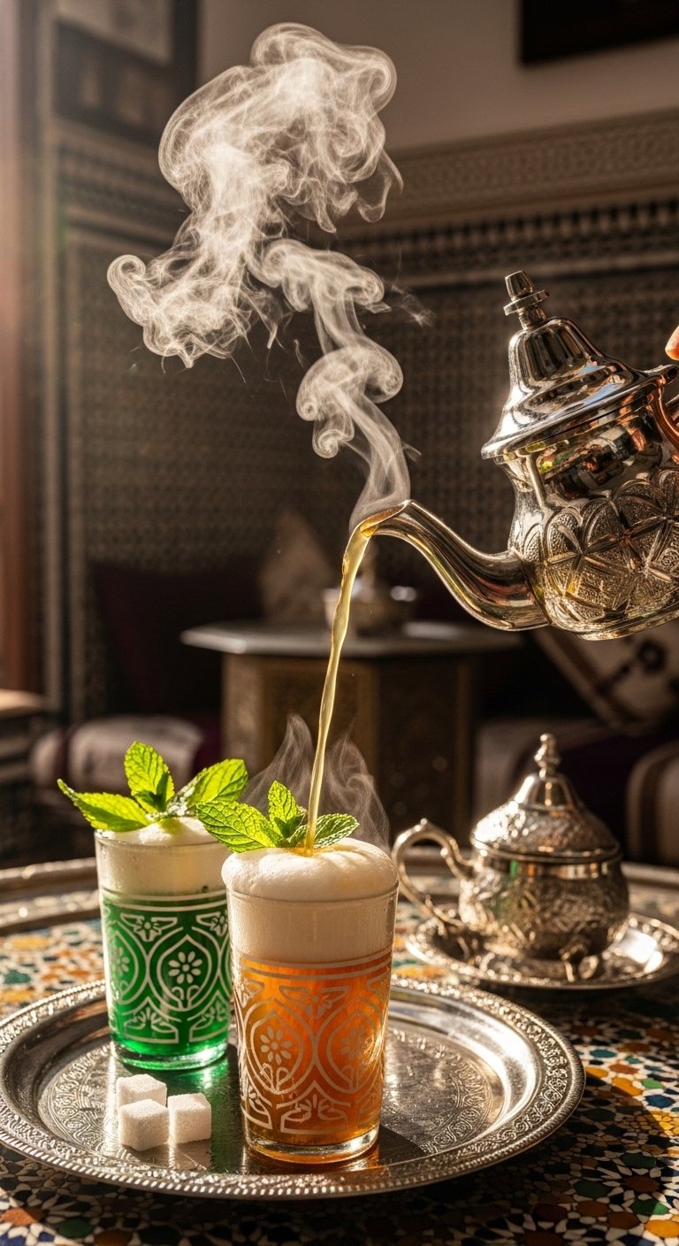 Pouring Moroccan mint tea from a high altitude pushes fresh air into the stream. This physics trick cools the boiling liquid down to a drinkable temperature instantly. The long drop crashes into the glass and creates a thick layer of white foam on top. The foam traps the sweet aromas inside the glass and shows deep respect to your guests.