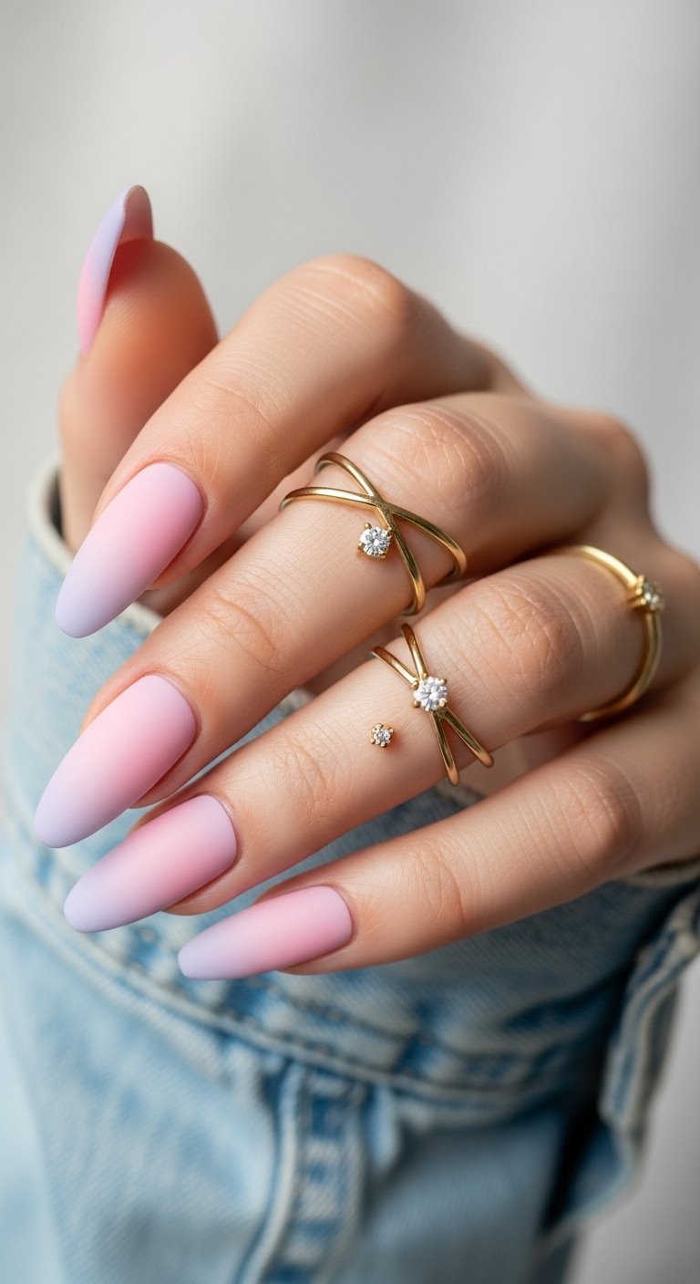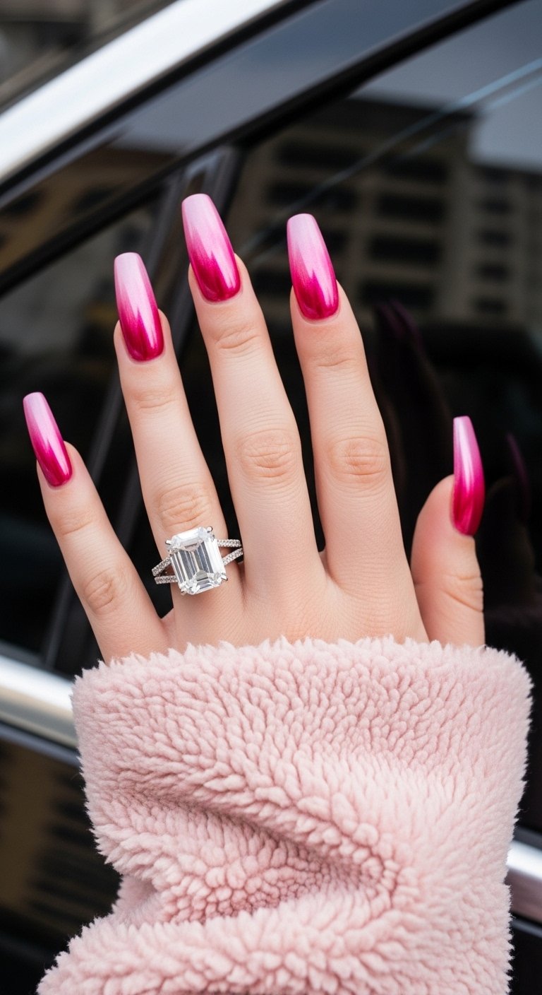 Soft pastel pink fading into bright magenta creates a striking visual. This ombre effect draws the eye down the hand. The transition makes short fingers look much longer. You get a soft blend that mimics a natural sunset. The style balances boldness and subtlety well.