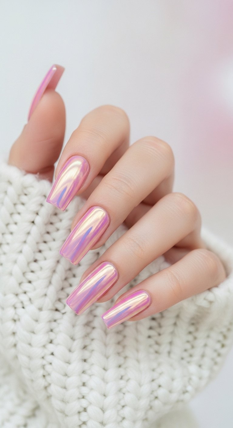 Holographic glitter covers a sheer strawberry base. The tiny glitter particles shift colors in direct sunlight. The magical sparkle looks different at every angle. This dazzling style commands attention at night.