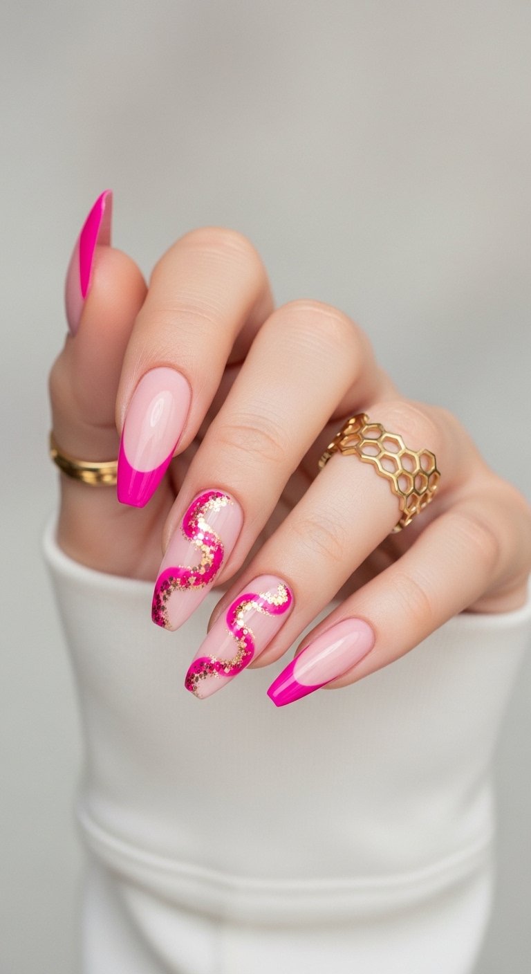 You start with a sheer jelly pink base. You apply two thin coats for a milky finish. You use a thin liner brush to draw the hot pink tip. You anchor your elbow on a table for a steady hand. You sweep the brush from the side toward the center.
