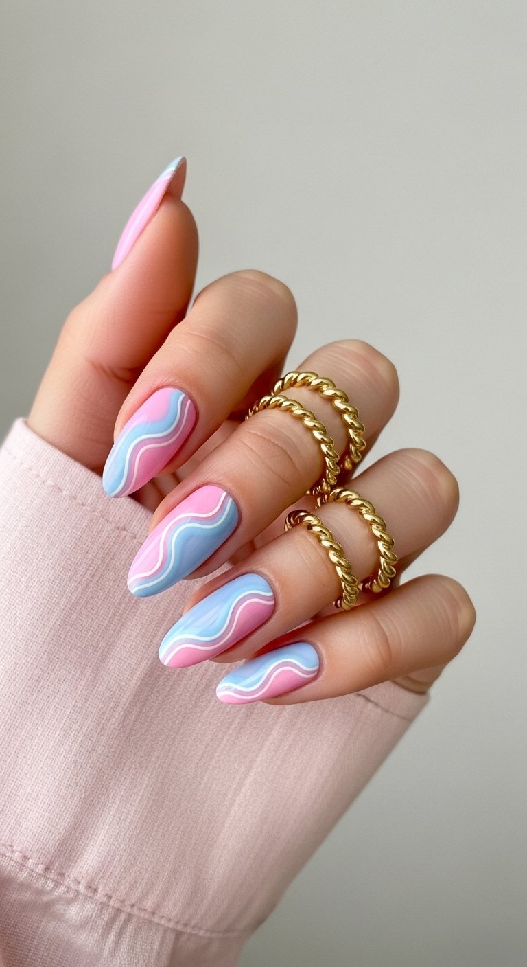 Pastel blue and light pink swirl together like marble. The soft colors blend into each other. The fluid pattern mimics natural stone or water ripples. This relaxing design brings a calm energy to your hands.