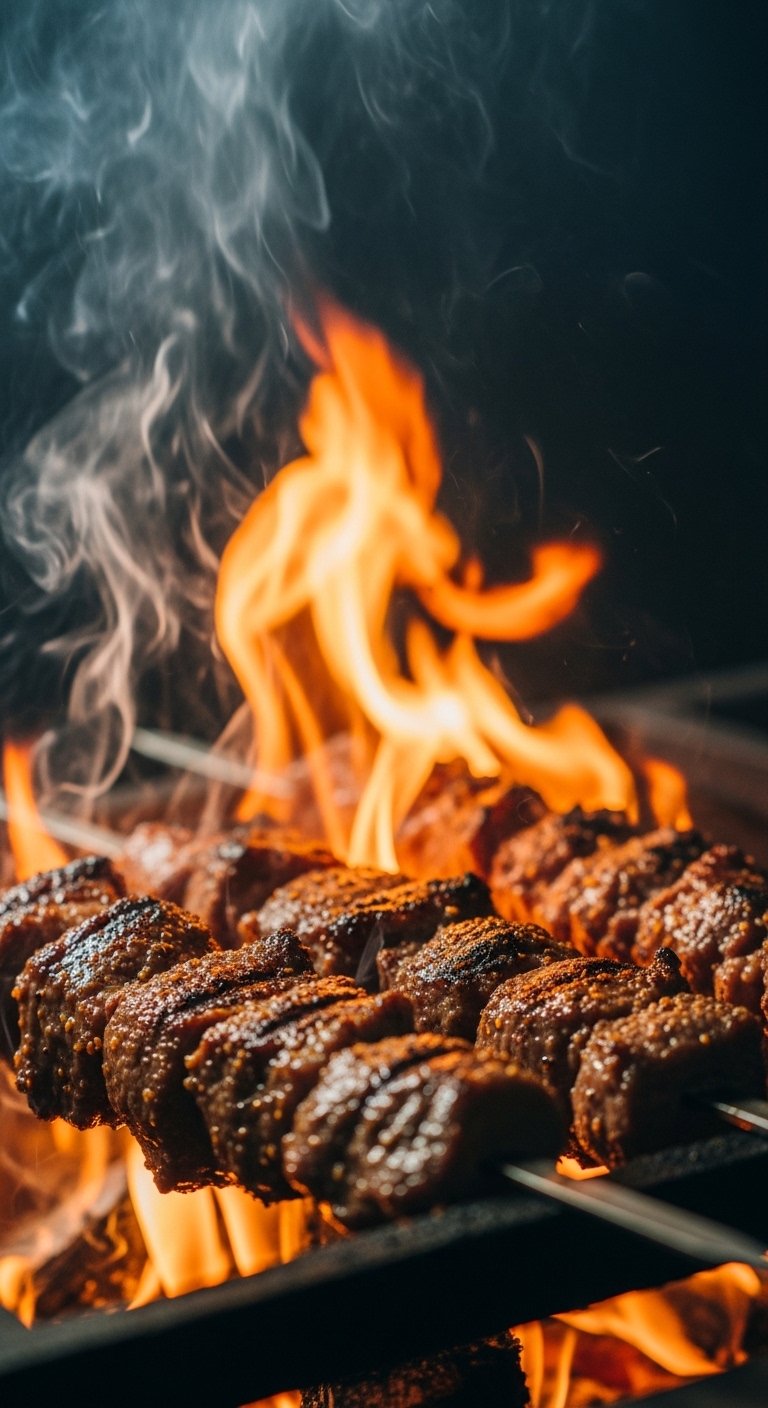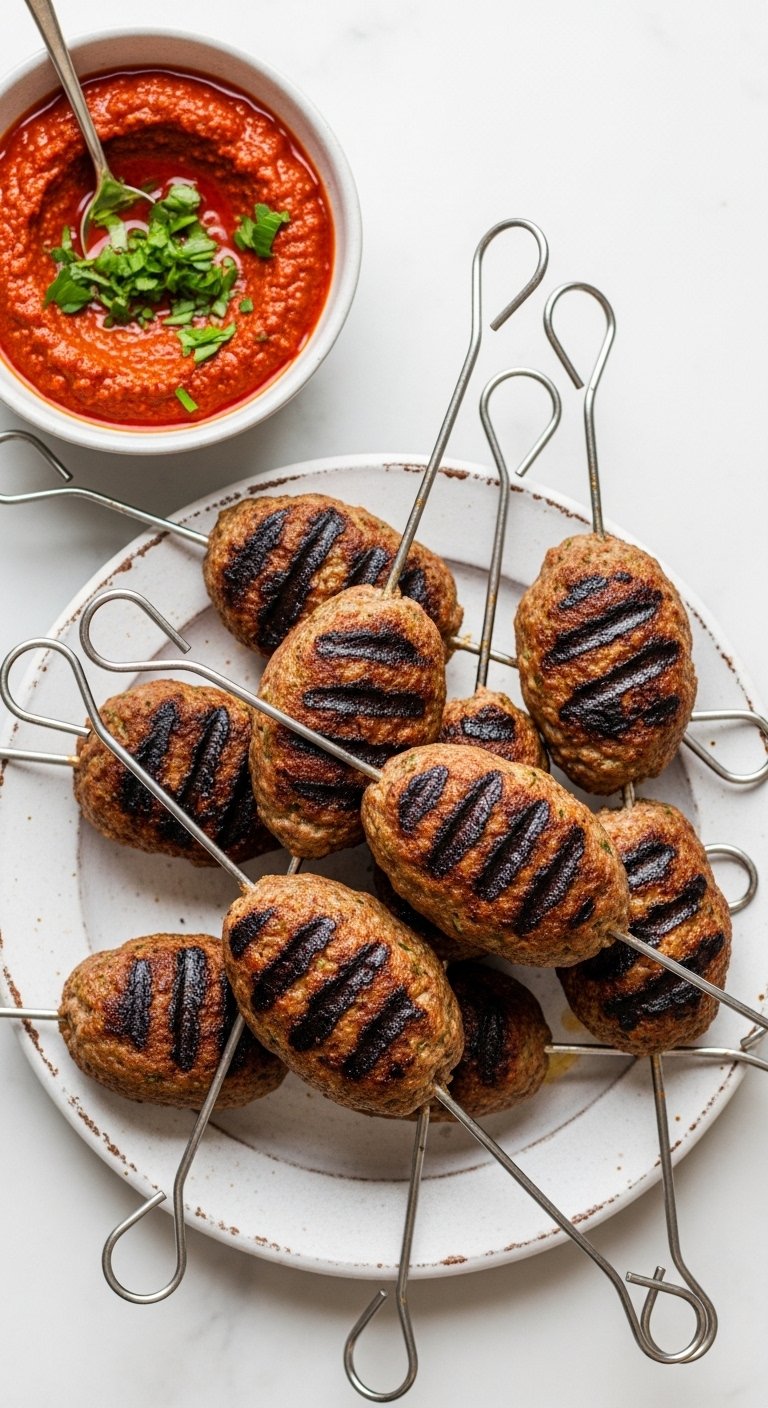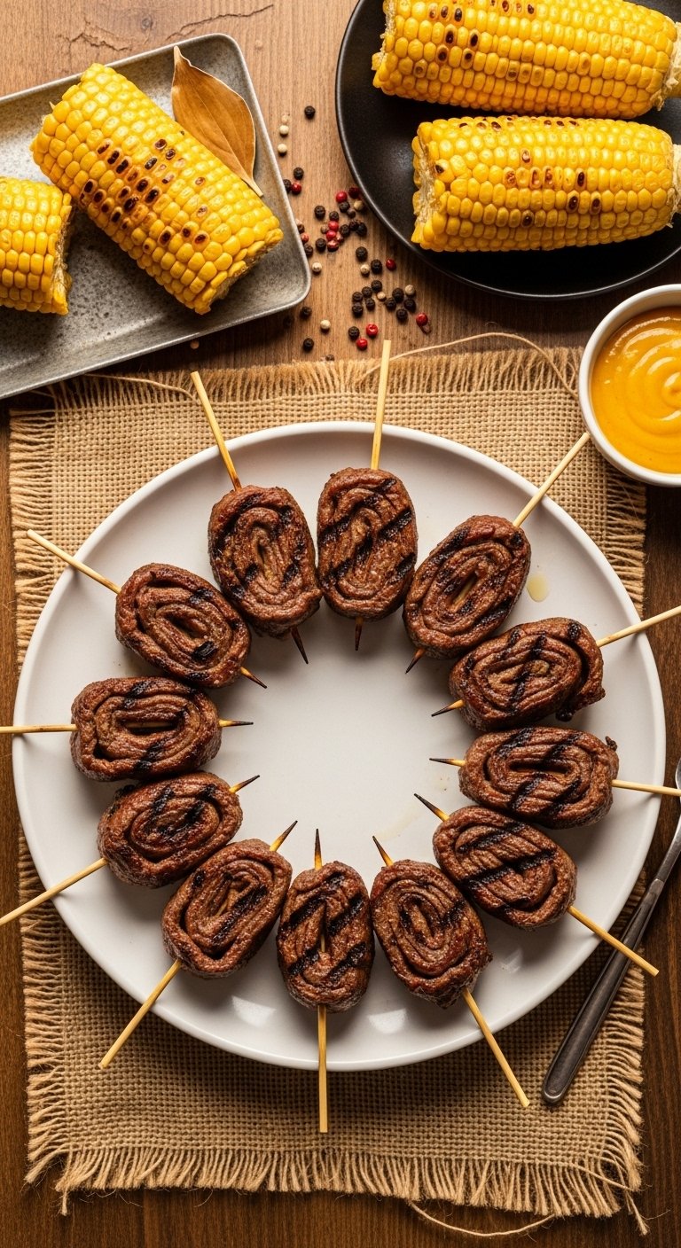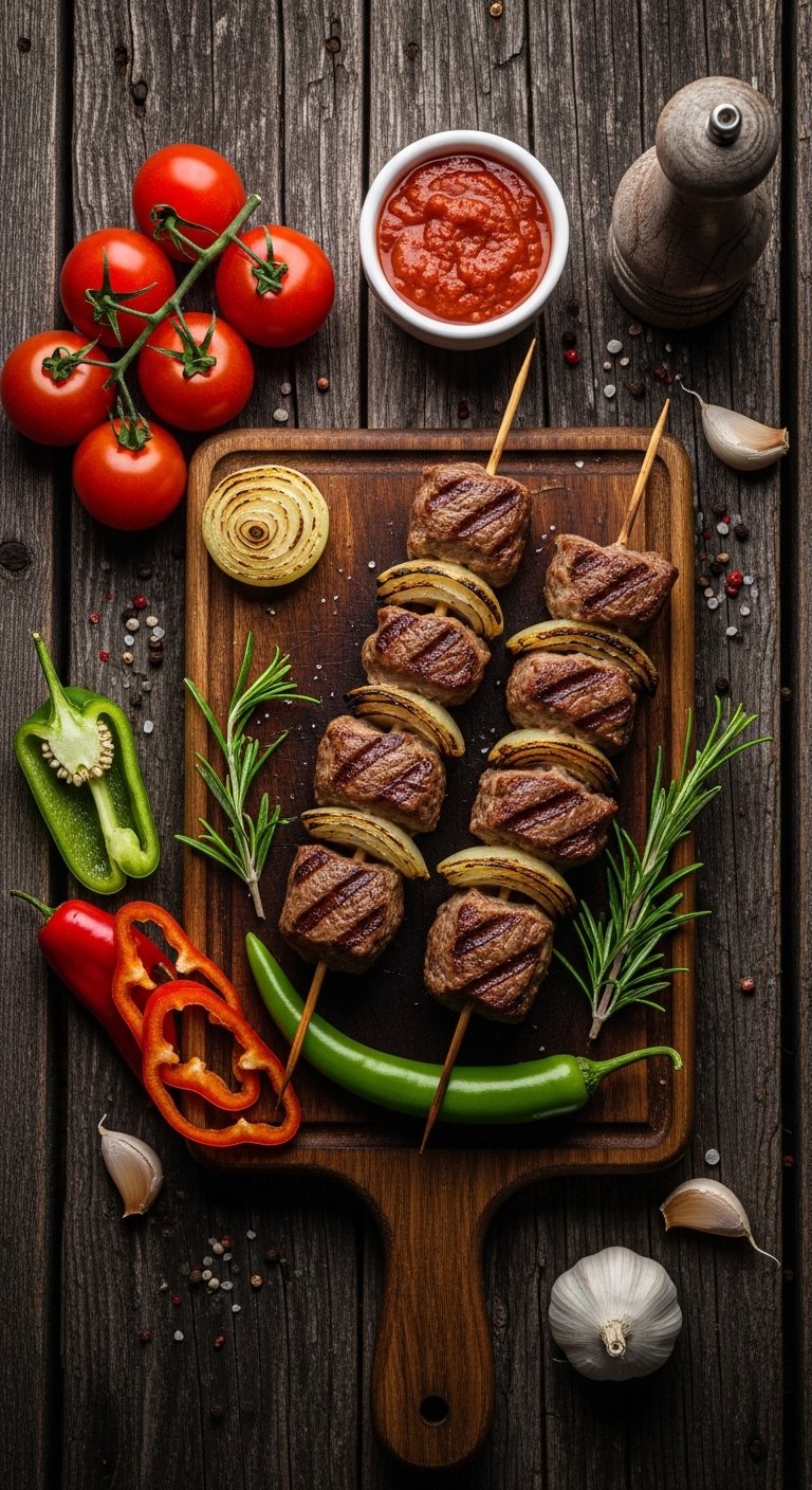 Creating a stunning presentation of the meal begins with visual contrast. Bright green parsley pops against rich dark brown grilled beef. The design principle of color theory makes this dish look appetizing on any white ceramic platter. Your ingredients include premium sirloin steak cubes matched with fresh garlic and melted butter. The instruction process remains simple and direct. You cut the beef into uniform one inch cubes to promote even cooking. You thread the meat onto soaked wooden sticks. You brush the loaded sticks with the garlic butter mixture. The cook time requires only eight minutes on a hot grill. You flip them once halfway through. The meat stays tender and juicy inside. The outside develops a beautiful charred crust. This method suits summer garden parties and formal dinners alike. Serving these on a wooden cutting board adds rustic charm to your table setting. Your guests will love the savory flavor profile.