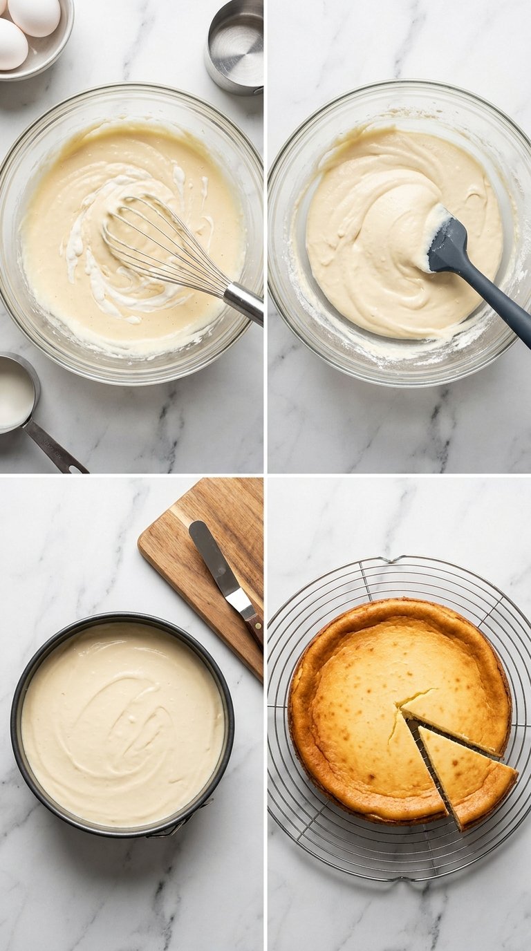 A beginner friendly method creates a perfect bake. You start by lining a round cake pan with parchment paper. This simple step prevents a sticky mess. Preheat your oven to a moderate heat level. A steady heat bakes the batter without burning the top. Grab a large glass mixing bowl. Combine your wet elements first. Beat the cheese and eggs until smooth. The pale yellow mixture looks glossy under the light. Add your dry powders into the wet bowl. Stir everything with a wooden spoon. A thick and heavy batter forms fast. Pour the pale mix into your lined pan. Smooth the top with a flat spatula. Place the pan on the middle oven rack. Bake the cake until the edges turn golden brown. The center will still jiggle a bit. Turn the oven off and leave the door open. Slow cooling stops the top surface from cracking. Let the pan rest on the counter.