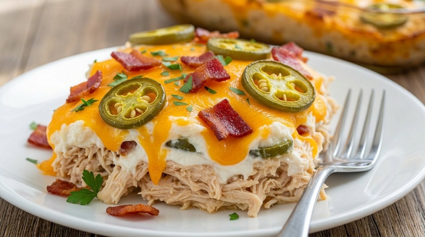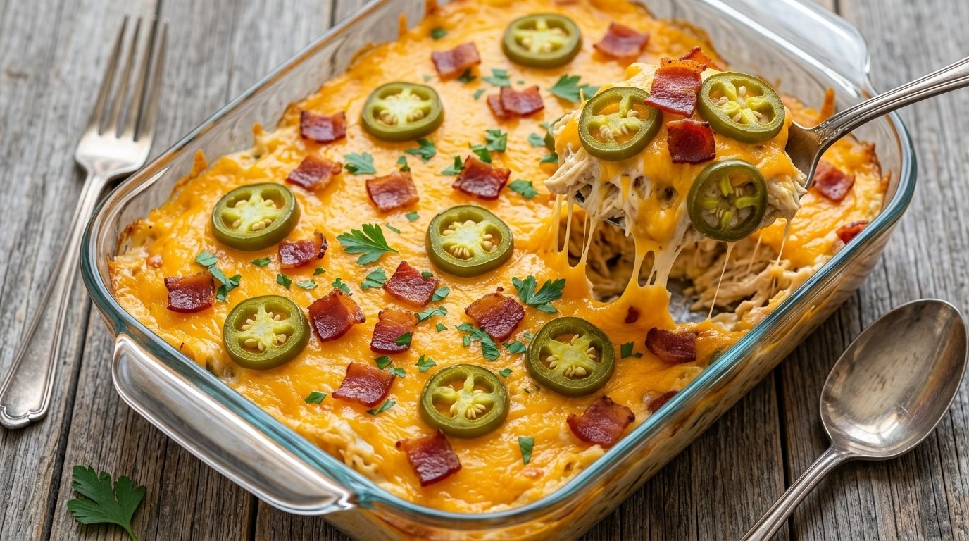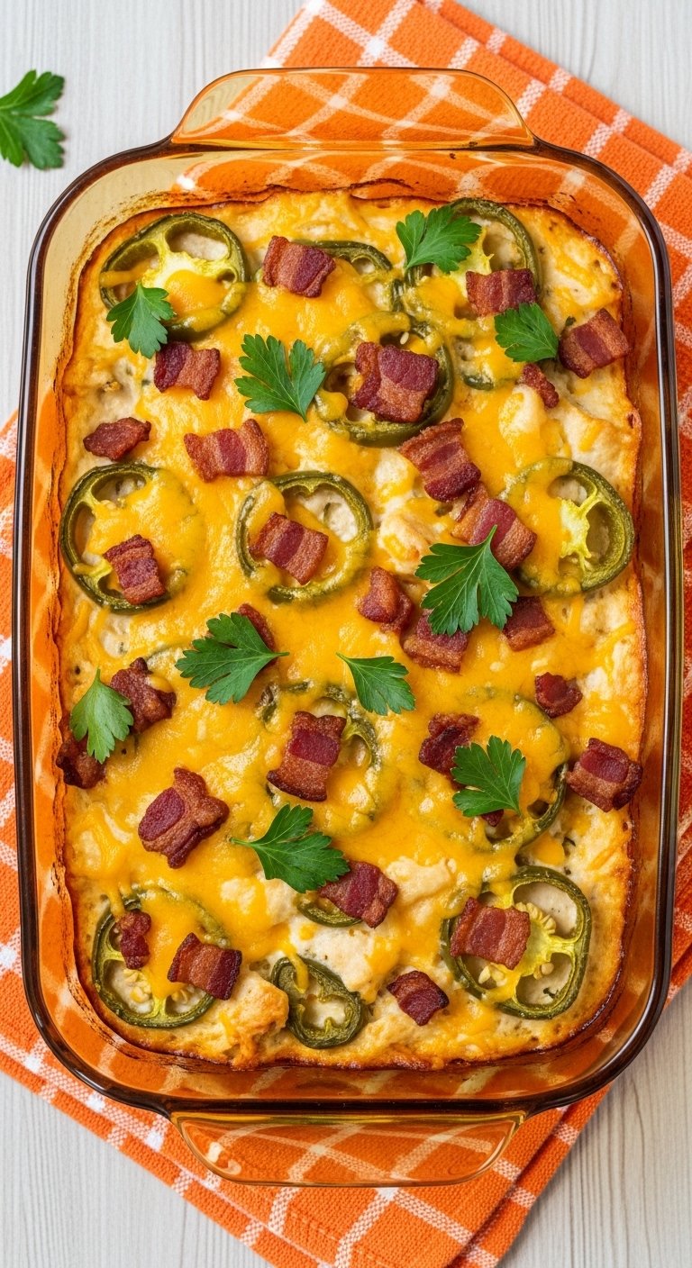 Here is a rich, savory recipe for a Jalapeño Popper Chicken Casserole, complete with plating tips and a short spoken presentation to highlight its best features.