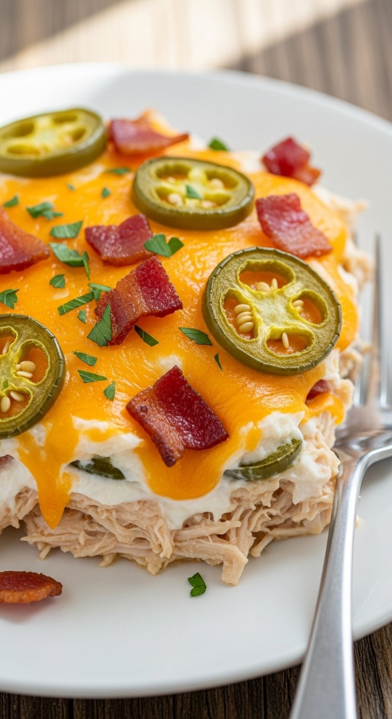 - Assemble: Spread the chicken mixture evenly into the prepared baking dish. Top with the remaining shredded cheddar and Monterey Jack cheeses. Scatter the remaining crumbled bacon and the reserved jalapeño slices over the top.