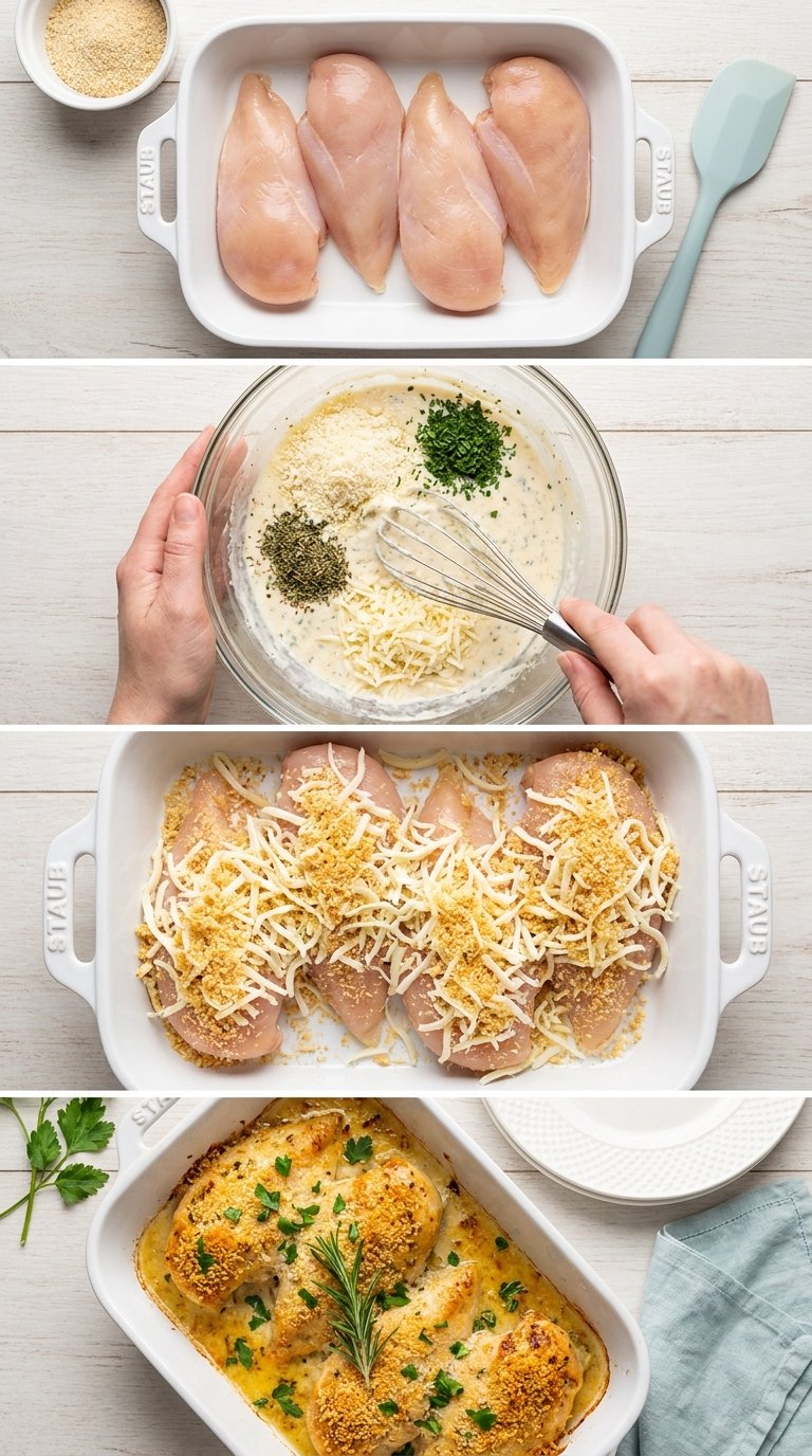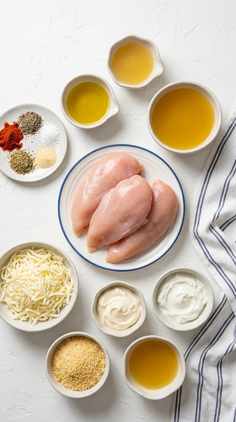 Gathering the right elements creates the foundation for a spectacular meal. The visual spread of fresh ingredients inspires confidence in the kitchen. Bright green herbs contrast against the pure white dairy and pale pink raw poultry. This aesthetic preparation stage sets a calm organized tone for the cooking session. Quality dictates the final flavor profile. Full fat dairy provides the necessary richness to withstand heat without separating. Lean protein requires this fat source to stay soft during the cooking process. Fresh garlic and pungent spices build layers of complex flavor. You need four large boneless skinless breasts to start. Buy one tub of premium sour cream. Grab fresh parsley and dried oregano from the pantry. Add grated parmesan cheese for a salty umami boost. Combine these elements on a clean wooden cutting board before starting. The organized workspace prevents mistakes and speeds up the process. Save this idea to your Pinterest.