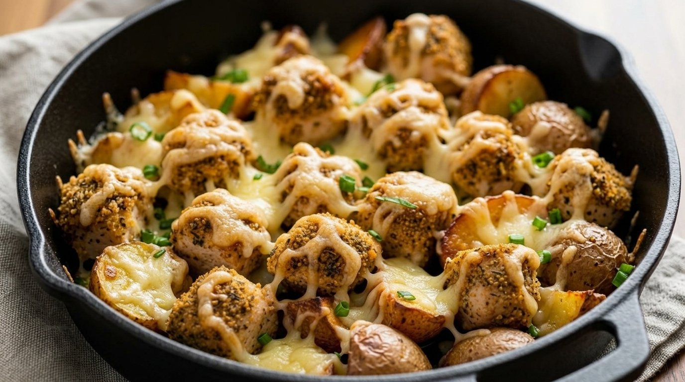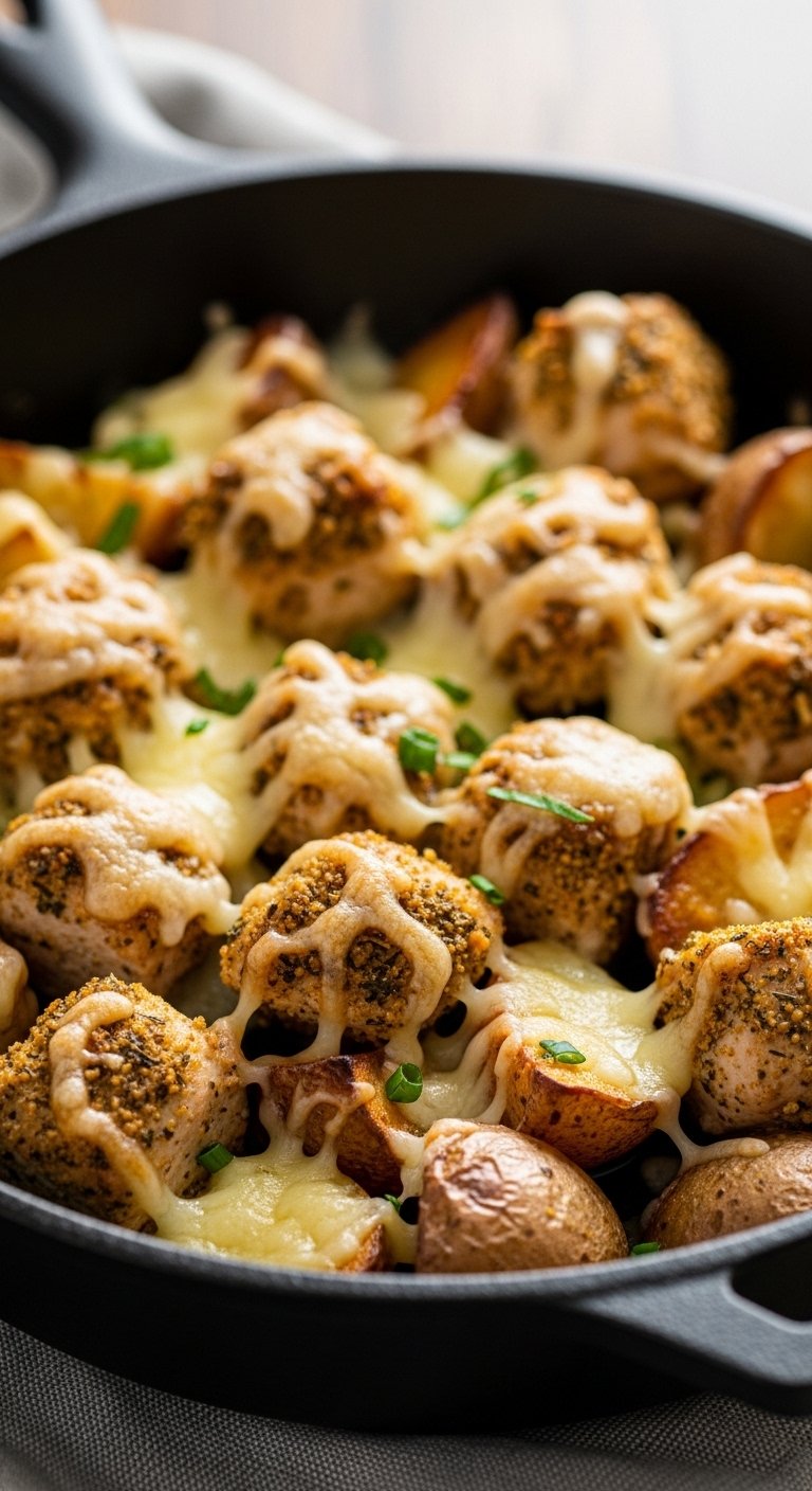 Start by heating a large pan over medium high heat with two tablespoons of oil. Toss your seasoned poultry chunks into the pan and sear them for five minutes per side until golden. Remove the meat and lower the heat. Add your halved potatoes and cook them for fifteen minutes until fork tender. Return the meat to the pan. Pour in the broth to scrape up the browned bits. Stir in the cream and grated cheese. Let it simmer for three minutes until thick.