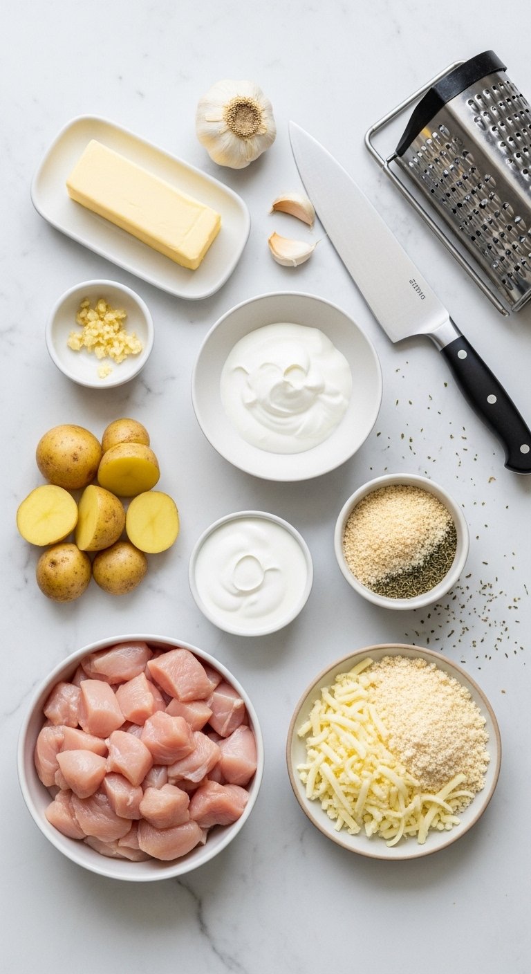 The foundation of a perfect garlic parmesan chicken and potatoes skillet recipe relies on high quality raw materials. Golden potatoes bring a creamy center and a firm exterior that withstands high heat. Fresh poultry absorbs seasonings rapidly and provides a rich protein base. Aged parmesan cheese offers a crystalline texture and sharp umami flavor profile that transforms a basic sauce into a thick coating. Fresh parsley adds a bright green visual contrast against the deep golden crusts of the seared meats. Choosing whole garlic bulbs over pre minced varieties guarantees a pungent aroma that permeates the entire dish.