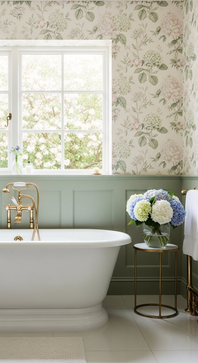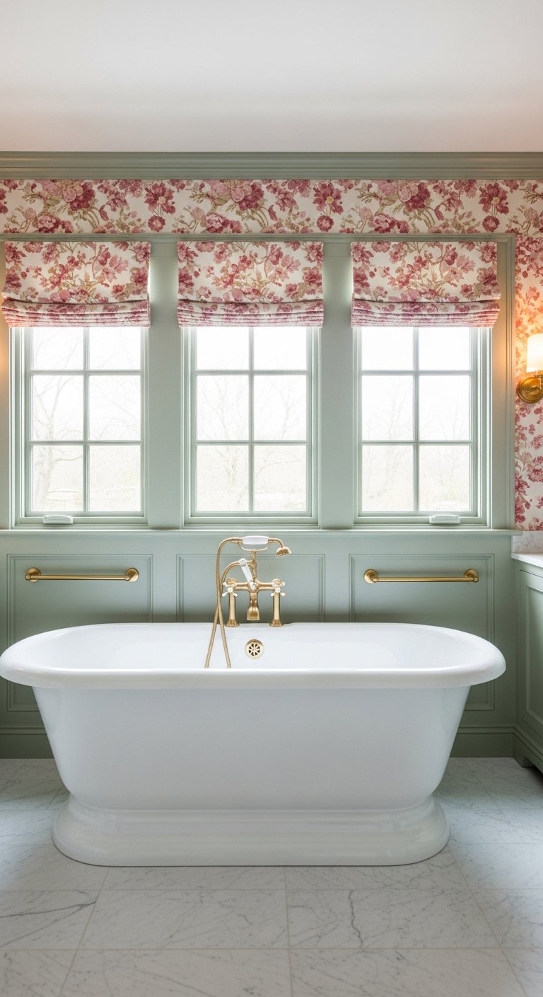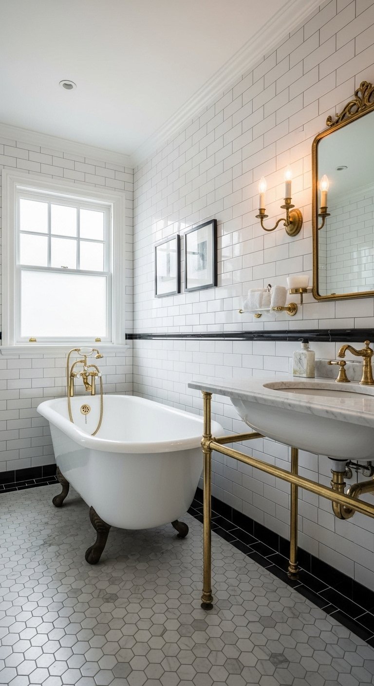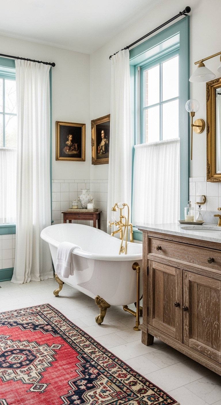 The Vibe: Airy, elegant, and filled with intricate details. Think 1900s London townhouse meets clean luxury. This style focuses on maximizing natural light and using white as a base color to make small vintage bathroom ideas come to life.