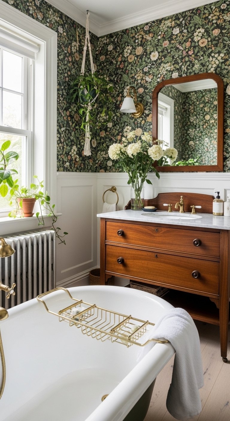 You don’t need to renovate to get the look. Start by swapping your hardware (cabinet knobs and faucet handles) for brass or ceramic options. Paint your vanity a deep mood color like navy or sage. Finally, replace your lighting with warm Edison bulbs and add a vintage rug. These cosmetic changes cost under $200 but drastically change the vibe.