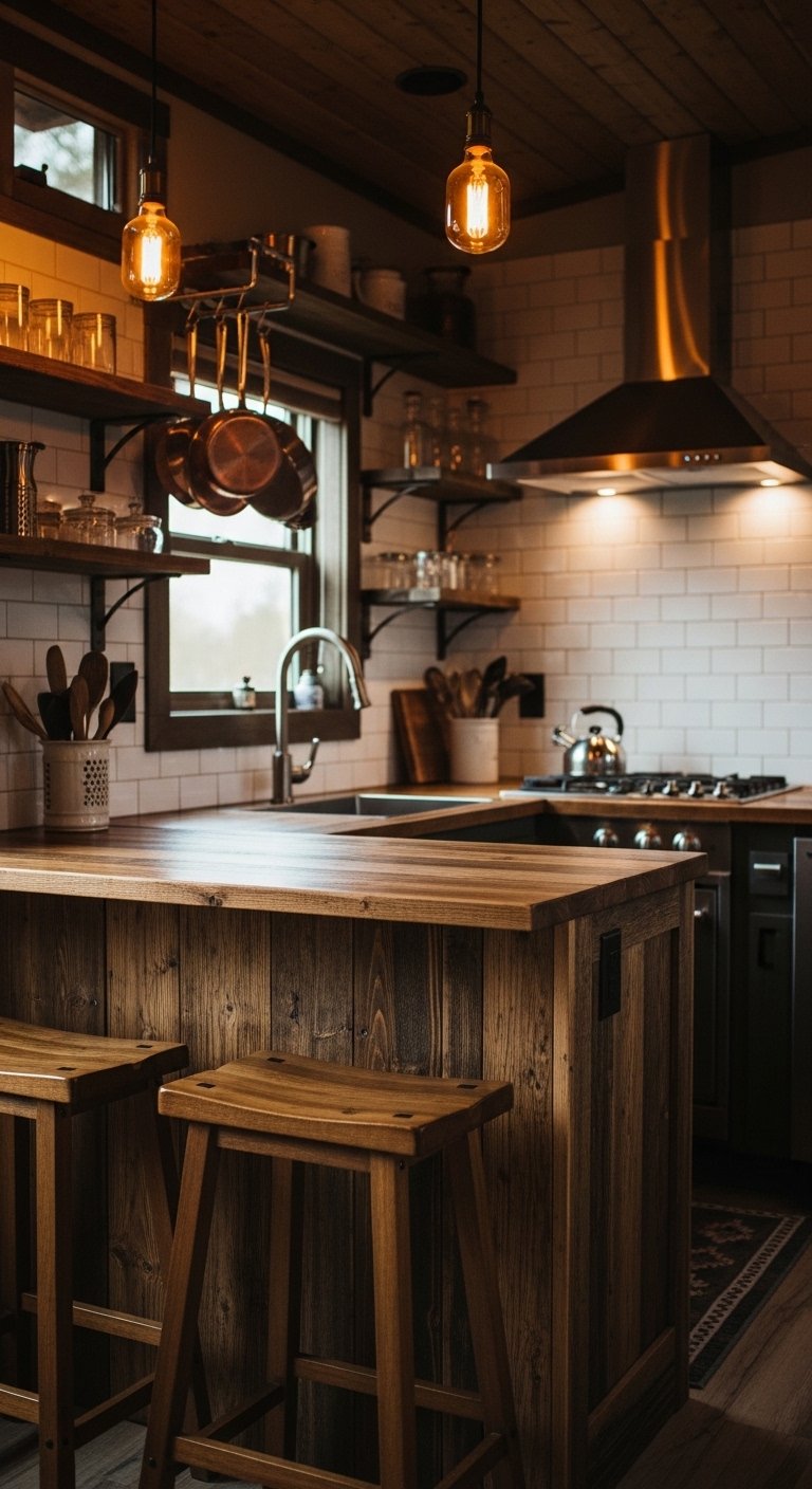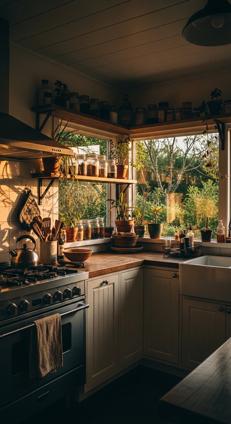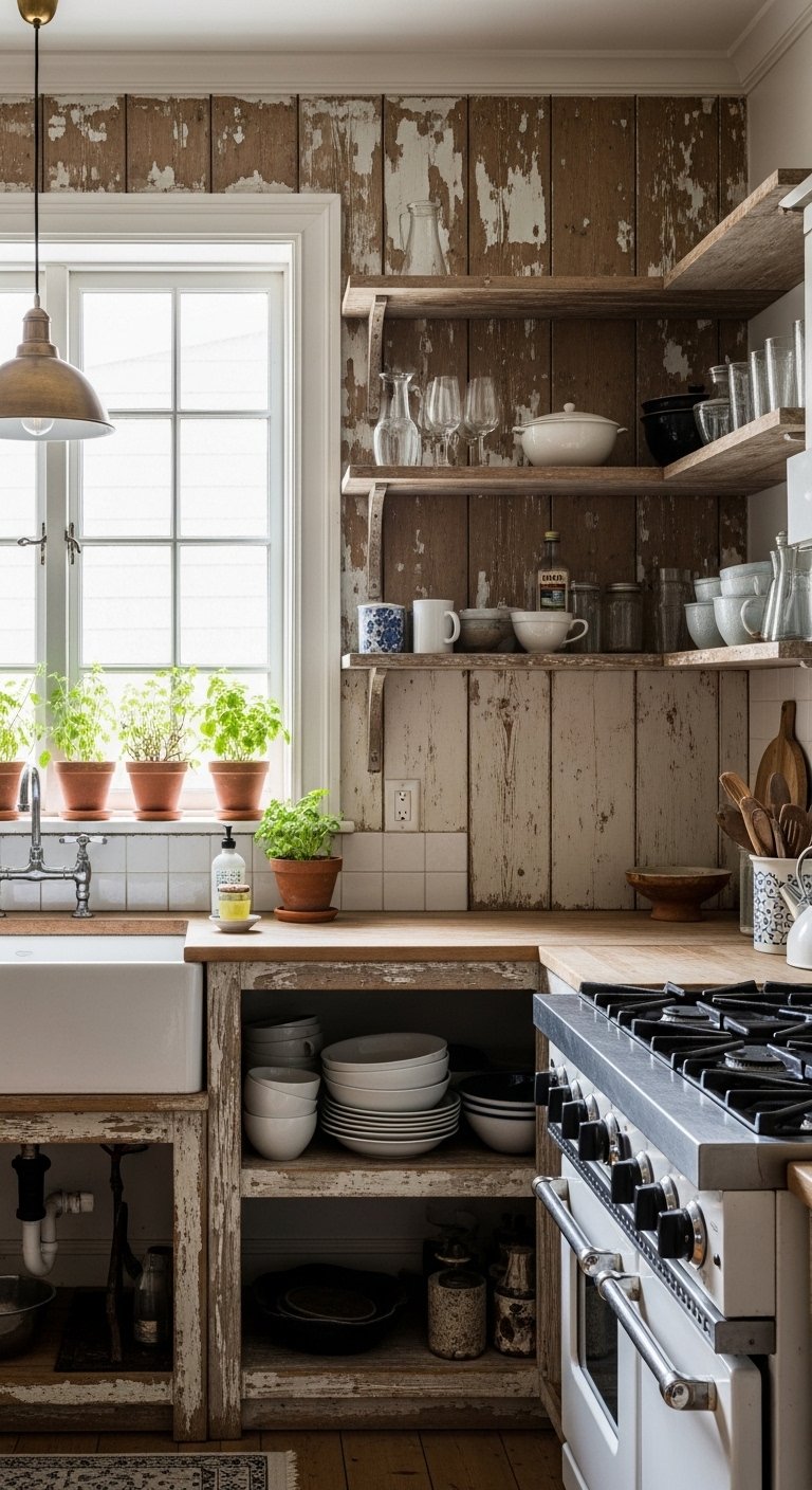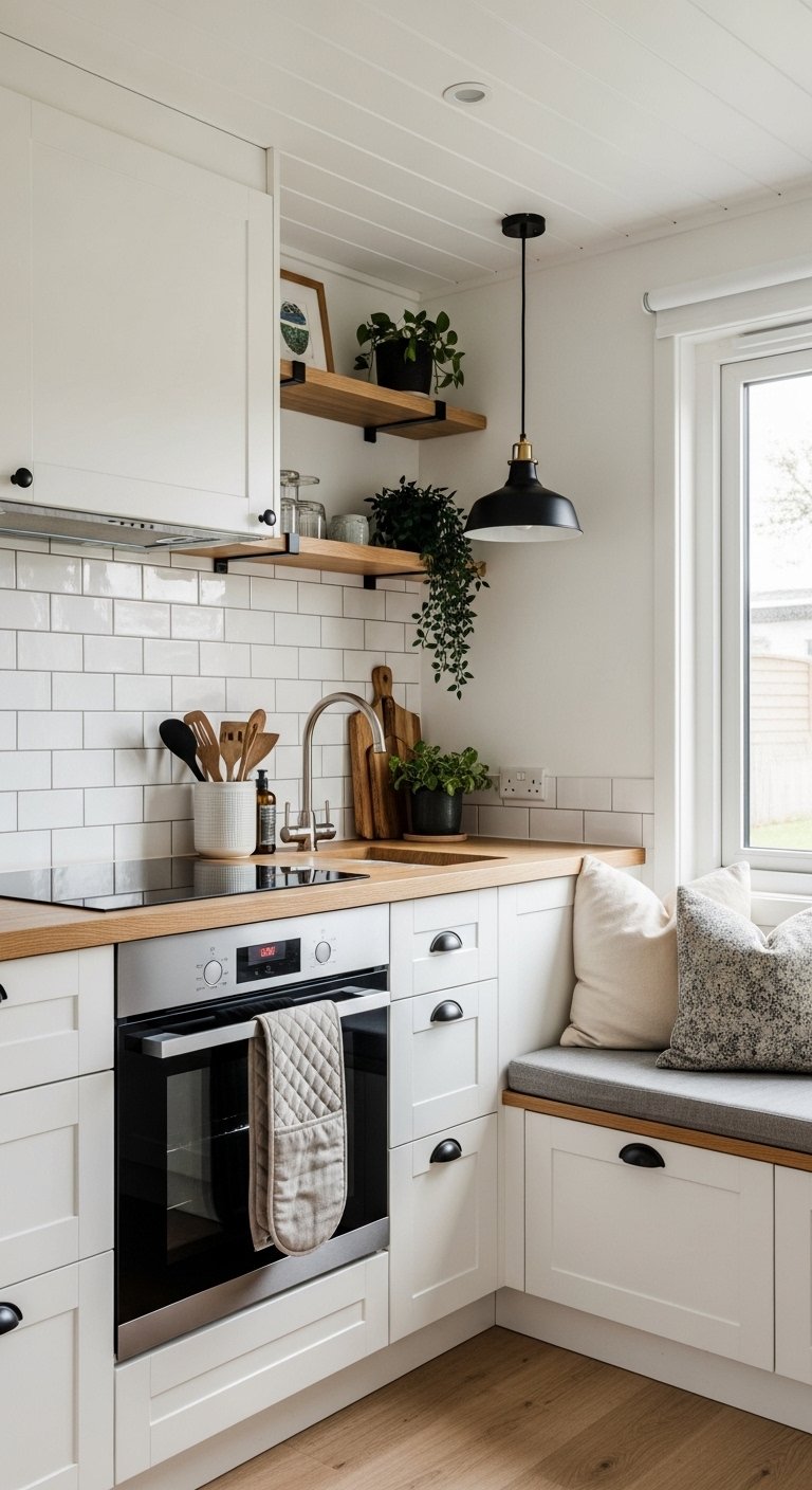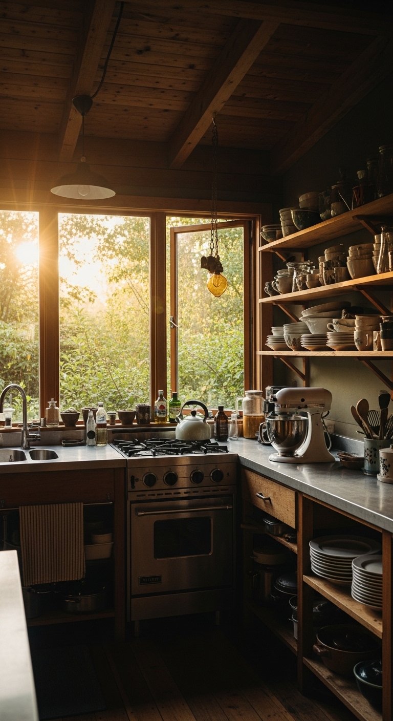 - Openness Creates Depth: Swapping heavy upper cabinets for open shelving pushes walls back visually and forces organized curation.