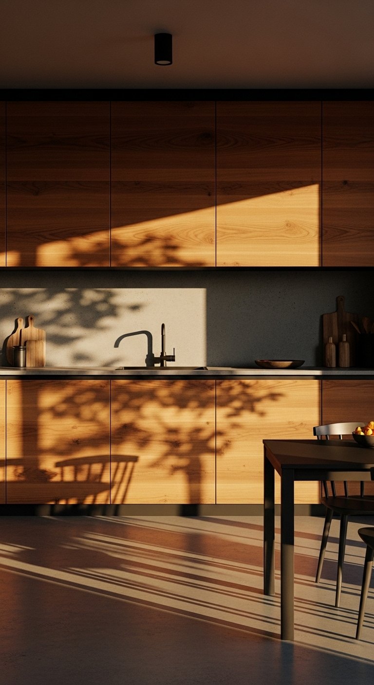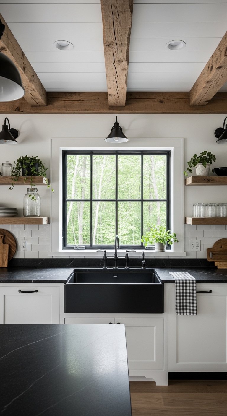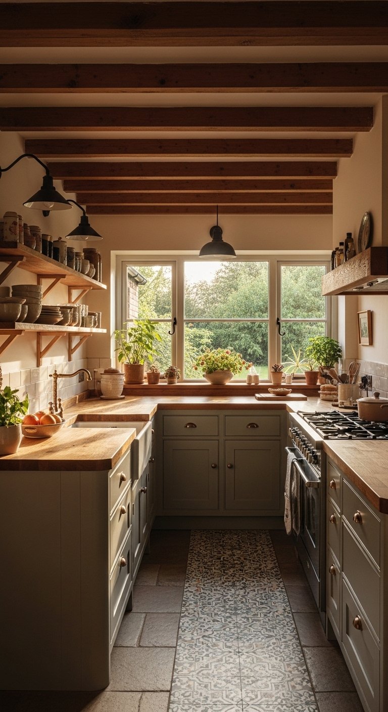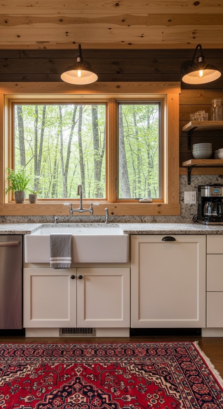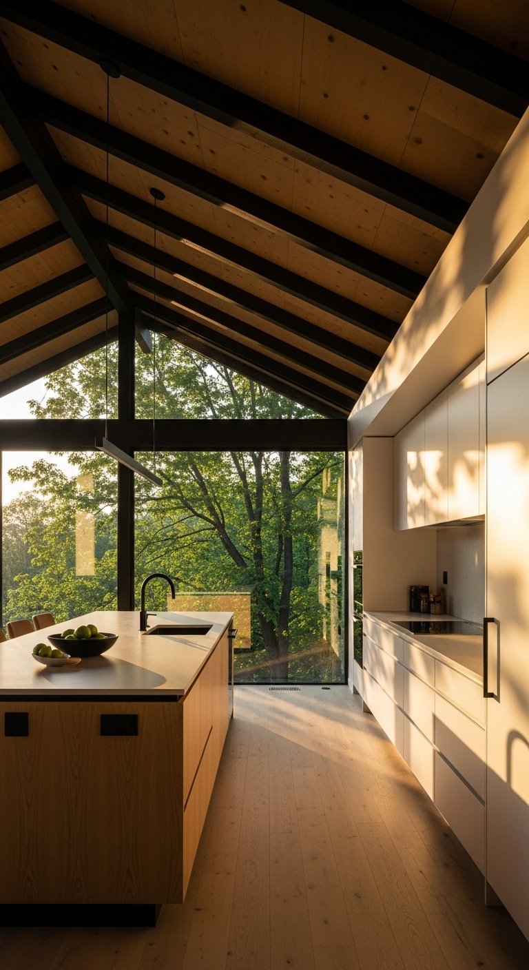 - Openness Creates Depth: Swapping heavy upper cabinets for open shelving pushes walls back visually and forces organized curation.